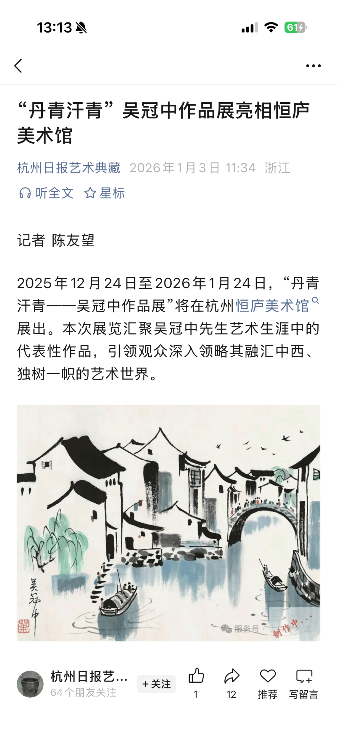 2月9日上午, 美术报接到读者报料,称杭州恒庐美术馆 “丹青·汗青——吴冠中作品展”全系赝品。记者第一时间联系了馆长,但电话一直无人接。随后,记者又联系了杭州市上城区公安局,回复说有情况会第一时间发公告。