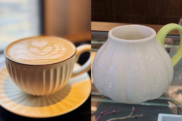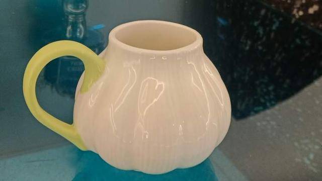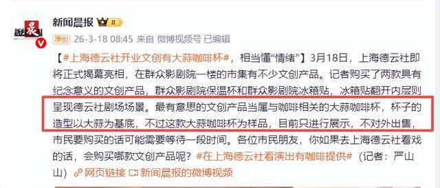 剧场一楼的文创展台上,摆出了一款新品:白瓷杯身,做成了大蒜的造型,把手是淡绿色的,标签写着“大蒜咖啡杯”。