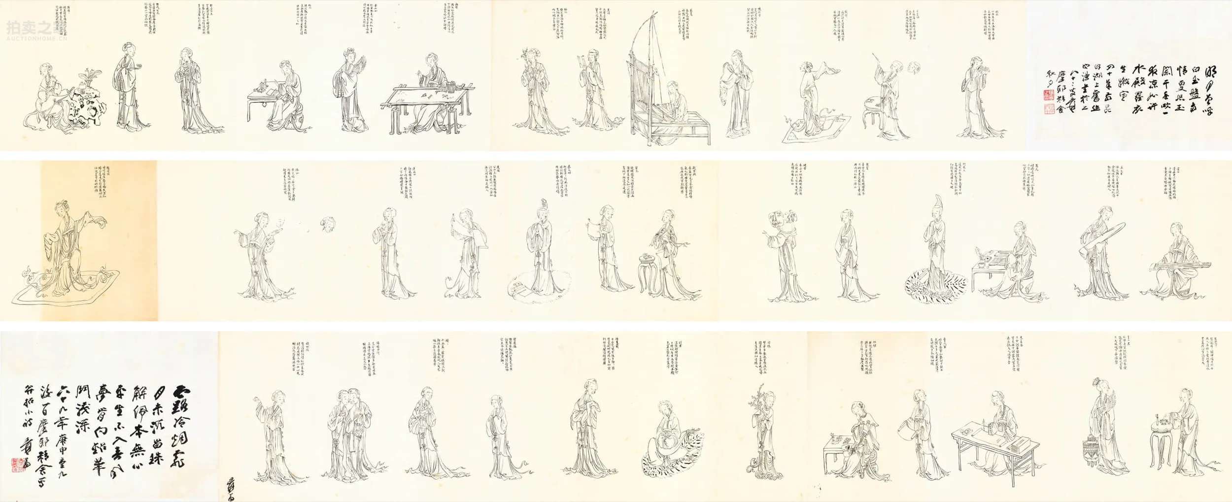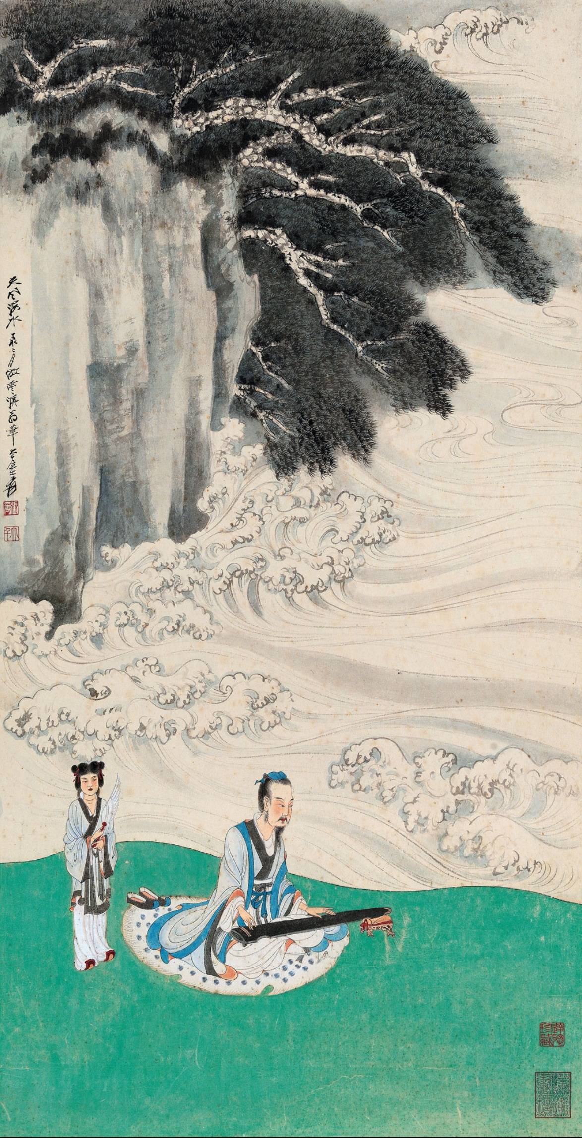 大千原作,“天风海水”盛唐气韵,1947年《大千近作展览目次》收录,同年《大千居士画影集》有图像纪录,由实业家黄溯初购得后,又为家侄黄达聪永久珍藏,流传脉络清晰。高士抚琴,童仆相伴,青绿设色加局部描金,工致处追中古技法。正是白居易诗中“簟拂碧龙鳞,扇摇白鹤翅”的盛唐富贵气息。