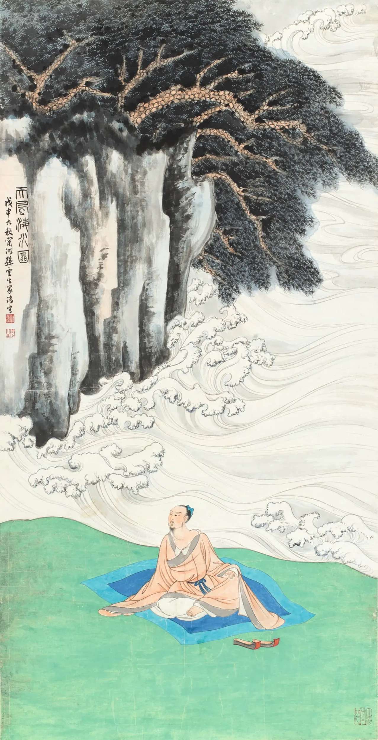 孙云生作为张大千入室弟子,孙云生深得泼墨泼彩真传,笔墨功夫扎实。这件作品也有数次展览出版,尺幅甚至比大千原作更大,高士姿态亦有调整,画面从大千的“天人合一”转为“文人自适”笔墨技法都能看出师承痕迹。