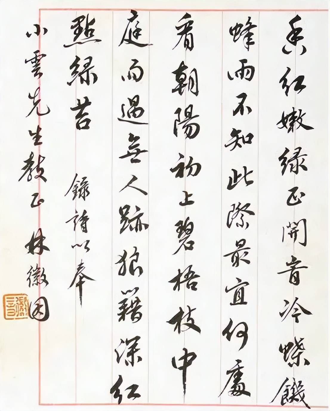 林徽因的楷书既有行书、隶书的气息,横画收尾的顿笔、笔画的连带等,都是“褚楷”的标志性特征。她的字形外圆内方,结构宽敞,四面展开,字内的空间疏朗通透,转折时既有方圆之分,切笔清晰有力,颇具韵味。