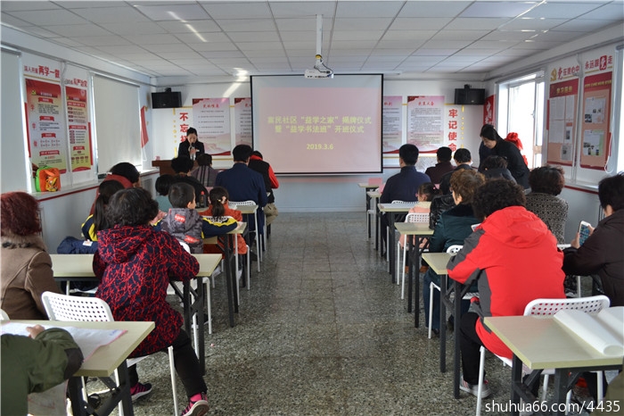2019年3月6日13时30分,大连市沙河口区马栏街道富民社区在辽南物业四楼百合之家党群活动室举办“益学之家”、“马栏街道关心下一代温馨站——富民社区分站”揭牌仪式暨“益学书法班”开班仪式。辖区离退休人员、中小学生以及马栏街道文化站站长 吕泓澎、关工委常务副主任 张大艳、青少年公益书法教室书法指导教师 何涛、墨雨书画院院长 柴培伟、荣誉院长 尹杰、副秘书长 肖慧、辽宁省工艺美术家协会会员 吕永振作为本次活动的嘉宾参加了仪式。