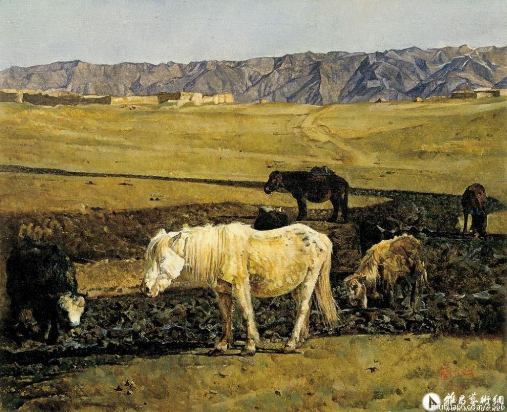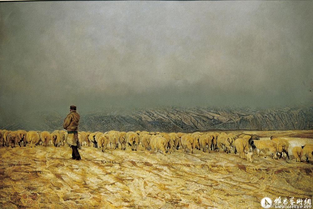 带着对中国北方自然的感受,他到了西藏。在哪里,他看到了更为原始的自然和更为宽广博大的大地,他1990年代以来的作品便与西藏的大地这个主题不可分离。许多中国画家也都到藏区去体验生活,为的是逃避城市的喧闹,寻找心灵的宁静,他们也大量描绘藏民和高原风光,为的是记录新鲜的影像。兰立斌与这些画家一样,也深为西藏的人与自然所感动,诱发起强烈的表现欲望。但与众不同的是,他更多地感受到那些具有永恒意味的实物。在他的作品中,藏民的身影和大地的身躯联系在一起,画面的气氛往往是凝重的。在造型上,人和环境密不可分,同样都是生命的存在。我不敢说他的每件作品都有足够的分量,但是像《走出冈底斯山》、《大牧场》、《唐古拉原野》、《唐古拉山上的云》等许多作品,的确展现了令人惊心动魄的视野。这些作品像宽银幕电影一样,摄取了横空出世般辽阔的高原、天空和大地。形象的质地坚实密集、画面的节奏紧劲连绵,天与地浑然一体,色泽浓重沉郁,空间却舒放宽广。这些画作,让人在精神上荡涤凡间的浊尘,向往永恒的境界。这些曾经感动过兰立斌的景象,同样给人以永恒的感动。