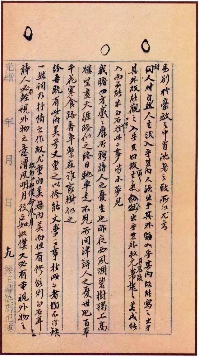 《人间词话》手稿,用毛笔写在一个普通的旧本子上。这个本子用直行稿纸订成,长方形,24厘米×16厘米。稿纸是毛边纸,为光绪年间所印,署有:“养正书塾札记簿”字样。手稿共二十页,后面附有静庵藏书目九页,内封上写了七绝六首。它第一次发表在1908年10月至1909年1月的《国粹学报》上,分三期连载。