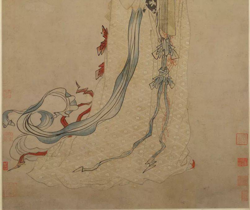 而衣裙、披肩、腰带则多以飘举方折之笔出之。