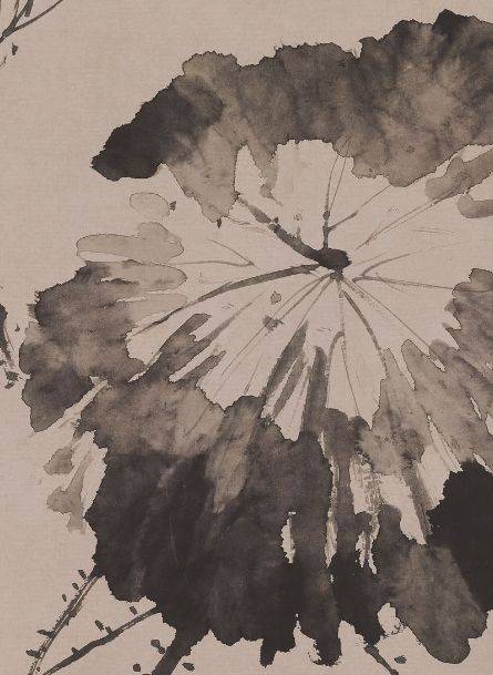 画面上端的荷叶宽大,荷杆细劲,墨色淋漓,墨点小而密。