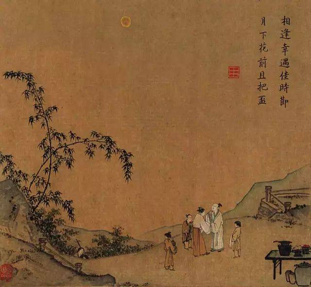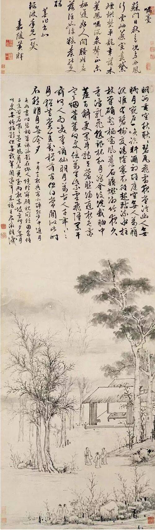 在中国传统绘画中,以文人月夜访谈为主题的创作并不少见,此图为代表作品之一。画面表现了画家与来客小醉后于秋天庭院中赏月话旧的雅会,寂静而明亮的月光,携无限情思,于画面之上浮现,并赋予中国画以新的图像内涵——与现实生活很近的亲切和悠闲。这也反映了当时士人高雅的生活情调,具有广泛的代表性。明中晚期,苏州地区发达的经济、市民阶层的兴起、相对宽松的社会氛围,让文士的生活愈加清雅而闲适,园林、家居等意象成为此时文人画自觉表现的主题。
