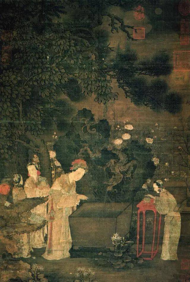此幅画明月皎洁,高挂天际。庭院深处,高植著虬松、梧桐与芭蕉,枝叶苍郁欣茂,地面另有芙蓉、蜀葵、雏菊等花卉,竞吐芳香。奇石上盘踞的蟠螭,正低伏泻水,池中波纹荡漾。盛装妇人,手捧明珠,欠身欲取水涤珠。旁立侍女三人,或临案焚香,或捧奁,或荷琴,神情庄严静穆。女子对月祈福,自唐代以降,即已蔚为流行,此作或与古代的拜月风尚攸关。