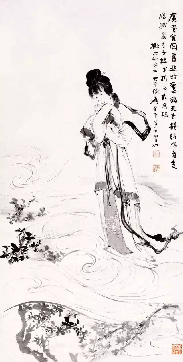 《嫦娥奔月》属于张大千早期人物画作品,《嫦娥奔月》墨笔纸本,描绘了嫦娥怀抱玉兔,脚踏祥云腾空飞去的一瞬。嫦娥神情哀怨,似乎饱含着对人间生活的无限眷恋。该作品人物造型非确,体态娉婷婀娜,衣纹行笔迅急婉转,兰叶折芦兼而有之,笔致清劲秀逸。仕女发髻的勾染率意虚和,颇有质感。面相也开始摆脱细目小口的概念化程序,呈现出肖像画的意味。作品笔调轻快,疏放灵秀,清新淡雅,雍容大方,明显取资于唐寅的意笔仕女画法,同时又不无华新罗的笔墨意谬。张大千就是这样广泛汲取传统的精华,唐寅画风对他的影响,可以说一直持续到三十年代末。