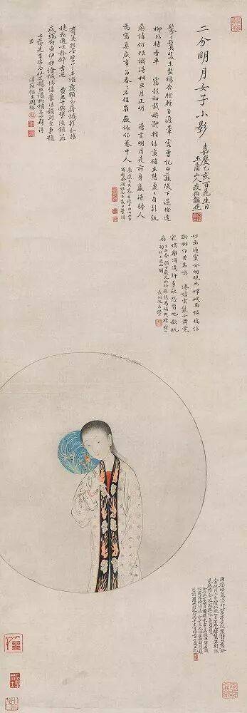 历代的中国人都会将嫦娥的美想象成一种最纯洁、最超逸、最美好和境界最高的美,改琦也不例外,他集合了所有他认为最好的元素—面容、肌肤、体态、表情、服饰、团扇、色彩等等赋予嫦娥,尽管在我们看来她与闺阁中的女子无异,只有别致的构图和将亭台楼阁换成一个空空的圆的安排,才多少会让人意识到她的不同凡响。