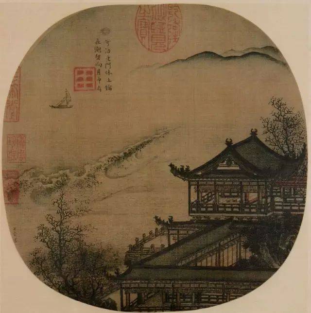 《月夜看潮图》所画即南宋时临安(今浙江杭州)中秋夜观海潮的情形。画中高悬的明月下,浪潮卷涌成一直线地奔驰而来;江畔华美的平台阁楼上,隐约可见有人穿梭、呼指着。整个画面没有拥塞的车水马龙、也没有激情喧闹的人海,取而代之的是远山江帆、月影银涛,一幕祥和而又没有纷扰的景致。李嵩以极为细腻的情感与笔触,描绘了精妙的楼阁与粼粼江涛,也写出了苏轼“寄语重门休上钥,夜潮留向月中看”的诗情,是一幅情景精致的杰作。