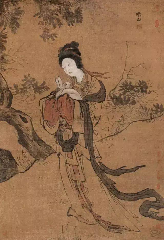 张路所画人物,用笔钢劲流畅,多作神仙、士子、渔夫,此幅《月殿嫦娥图》形象质朴,衣褶简洁,神态清朗。嫦娥怀抱月兔,二者眼神对接流露出怜爱之情。