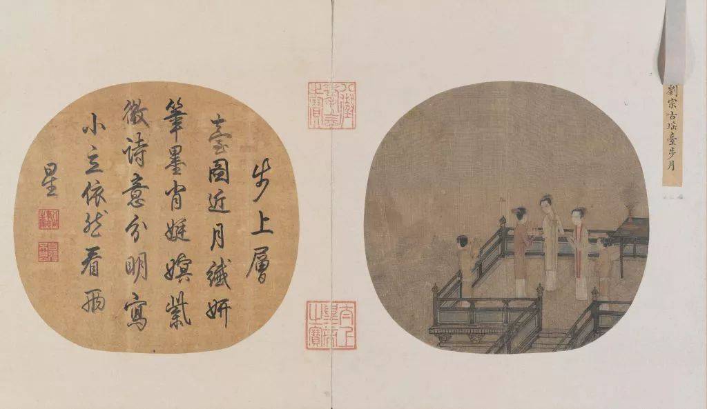 描绘中秋之夜,贵妇们聚集高台,吟诗赏月的情景。画面体现了宫廷生活与民间生活的密切关联。作者在人物创作的审美取向上以明代唐寅、仇英笔下的仕女画为审美标准,追求秀润飘逸的情致。她们三五成群地行进在以界画表现的亭台楼阁内或是细笔勾染皴点的花石下。富贵闲逸的宫苑生活令她们的物质生活十分充足,也使她们的精神世界极度贫乏。