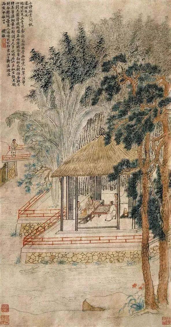 画中翠波渺渺中的一茅亭,亭内二老者围桌对弈,二书僮一旁侍候,桥上一僮子双手捧物而来。整幅画以墨缘点钩树叶,浅绛施染树石,笔法细密秀美,深得文氏之风范。画家对于画中的松针、竹叶、细草都一一刻画交代,毫发不爽,但却细而不碎,感染力强,整体感强。另外,茅亭中画有四个人物,着墨虽不多,但却情态各具。