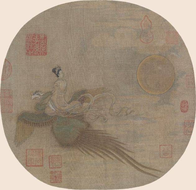 图绘一鸾凤于薄云淡雾中振翅飞鸣,其背上一仙女正茫然回首目视身后的一轮圆月。画家将仙女回眸之一刹那所显露出的怅惘之情刻画的生动传神,使本来单调的景物变得极富情趣并给人以想像力。仙女的眼神原无形,然作者却利用它使圆月和鸾凤之间产生一种内在的呼应关系,使画面具有气脉贯通的完整性。画家通过描绘仙女的衣带向后飘举暗示出无形的风力,并以此表明鸾凤疾翔时的速度与强烈的动感,与圆月之间形成动与静的对比。在人物形象的塑造上,仙女的造型越出了隋唐时期仕女画丰腴健壮的体态,表现出女性身材比例合理,造型匀称的特点。
