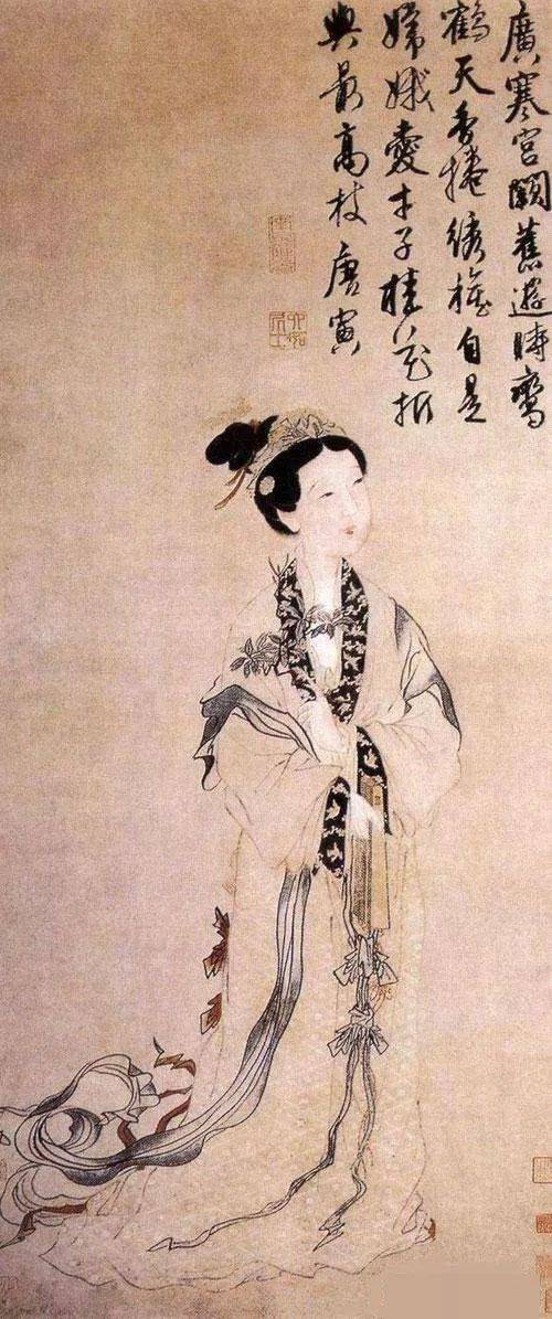 唐寅的仕女画法基本上有两种:一种是线条细劲,设色妍丽。一种笔墨流动,挥洒自如。画中嫦娥,用清丽圆细的笔触描绘其脸、手和胸。而衣裙、披肩、腰带多以飘举方折之笔出之,这种方圆兼施的笔法,增强了这位少妇轻移莲步的动态美。设色浅淡,年久有褪,益见清雅。此图嫦娥裙带漂零,神形和顺,手持挂彩。此作斗志昂扬,特别头部线条圆和流利,勾染适当,丽人的俊逸清丽之态毕现。画中刻画的良人,是中国今世神话传说中的月宫仙子嫦娥,只见画中嫦娥裙带漂零,样子形状和顺,纤纤玉手中拿着一枝木樨,彷佛在等着什么人的到来。唐寅用清丽圆细的笔触刻画了这位月中仙子的美好身姿,固然画面由于年月长远有些退色,但更增加了一种古色古香和清爽高雅的感受。脸孔的设色,敷红色晕染,如月色清凝,洁白典雅。