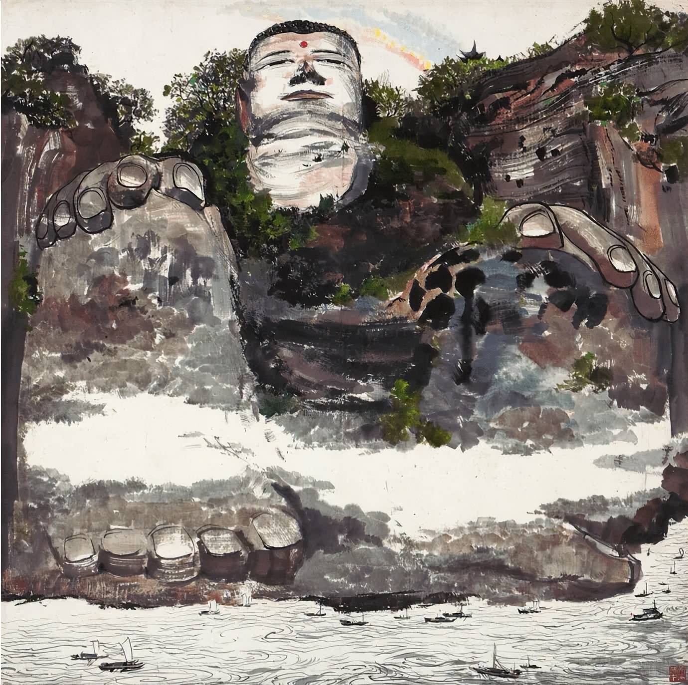 先是跑到大佛脚下仰着头画上半身,又爬到半山腰俯画其下半身,再转过头画大佛脚下的江流……