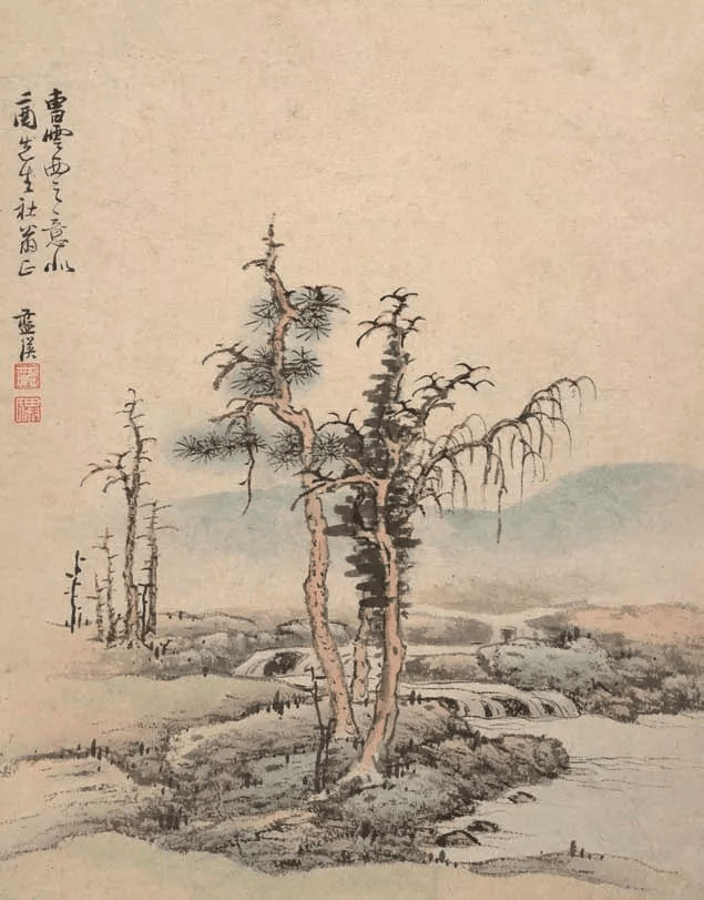 蓝瑛作品中最精的范例,或许是一部作于1642年的十二开画册,现存于大都会艺术博物馆。其中一幅仿曹知白笔意的册页,以其洁净且一望无际的构图,特别使人觉得引人人胜。曹知白作于1329年的《双松图》,有可能就是蓝瑛画中母题的来源:两棵树木倒向两边,远后方的则是较小而枯的树木,近景还有一道溪流流过。但是,这两幅画作的整体效果则非常不同,蓝瑛并未保留曹知白那种生动活跃的造型以及富有表现力的匠心经营,相反,他营造出了一幅静谧、辽阔的景致,使人想起倪瓒单纯平淡的江景山水。正如李铸晋所指出,晚明画家所作的曹知白风格,有将曹知白与倪瓒(这两位同时也是知交)混为一谈的倾向,此处所见的册页,可能正代表了这种错误的混合不过,忠实于元代大家的风格与否,并无关乎蓝瑛的画作是否成功。在蓝瑛的画中,平坦的视线具有稳定的作用,树木则呈现出具有韵律节奏的间隔,画面在往深处运行发展时,则甚为纵容且有抑扬顿挫。