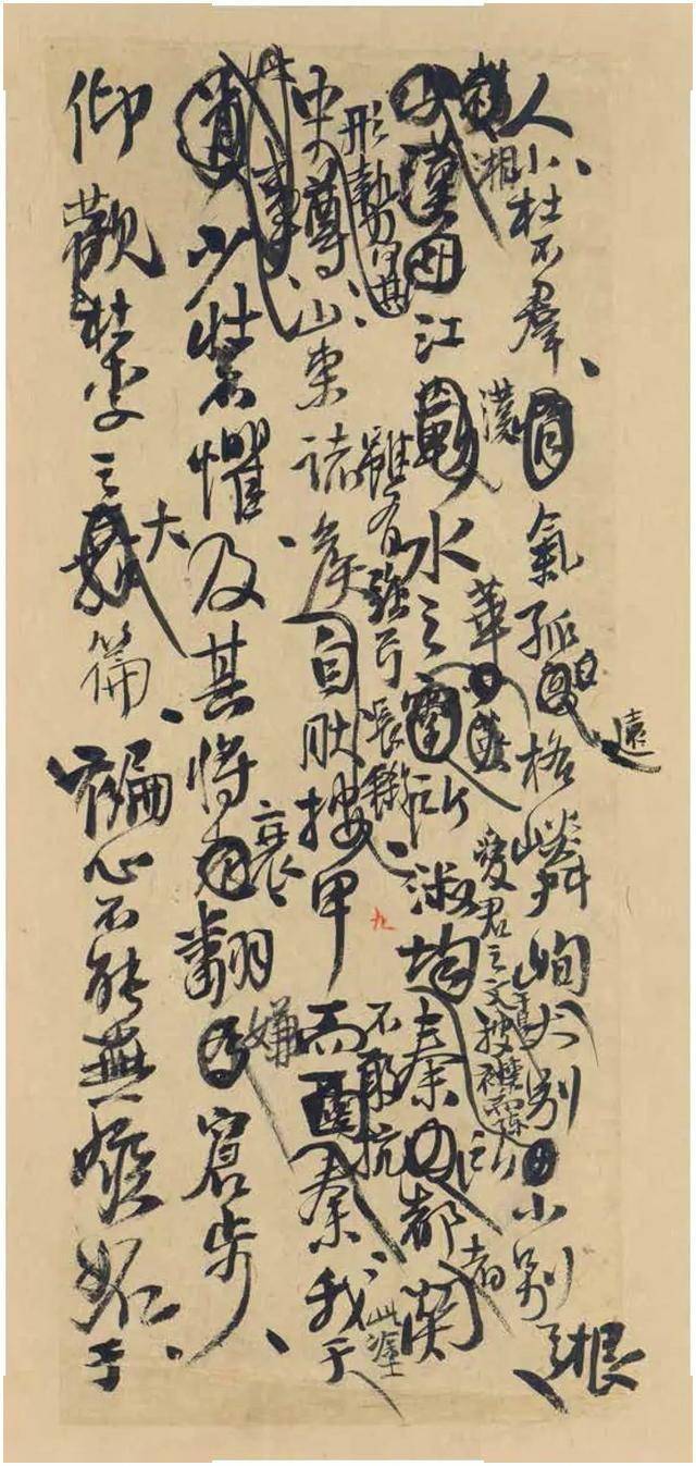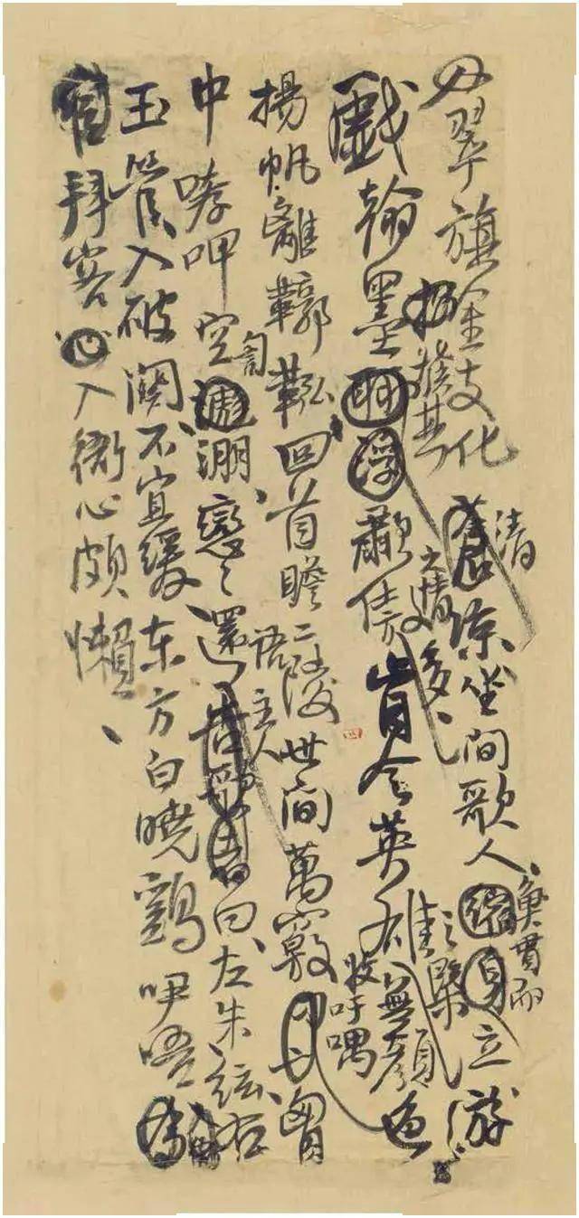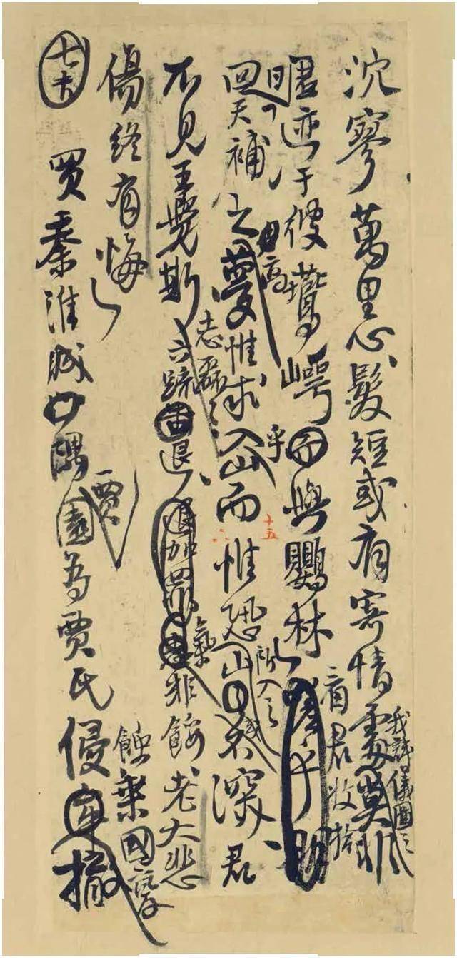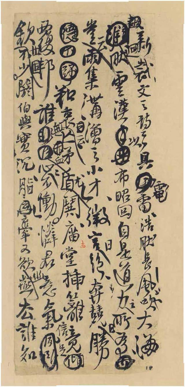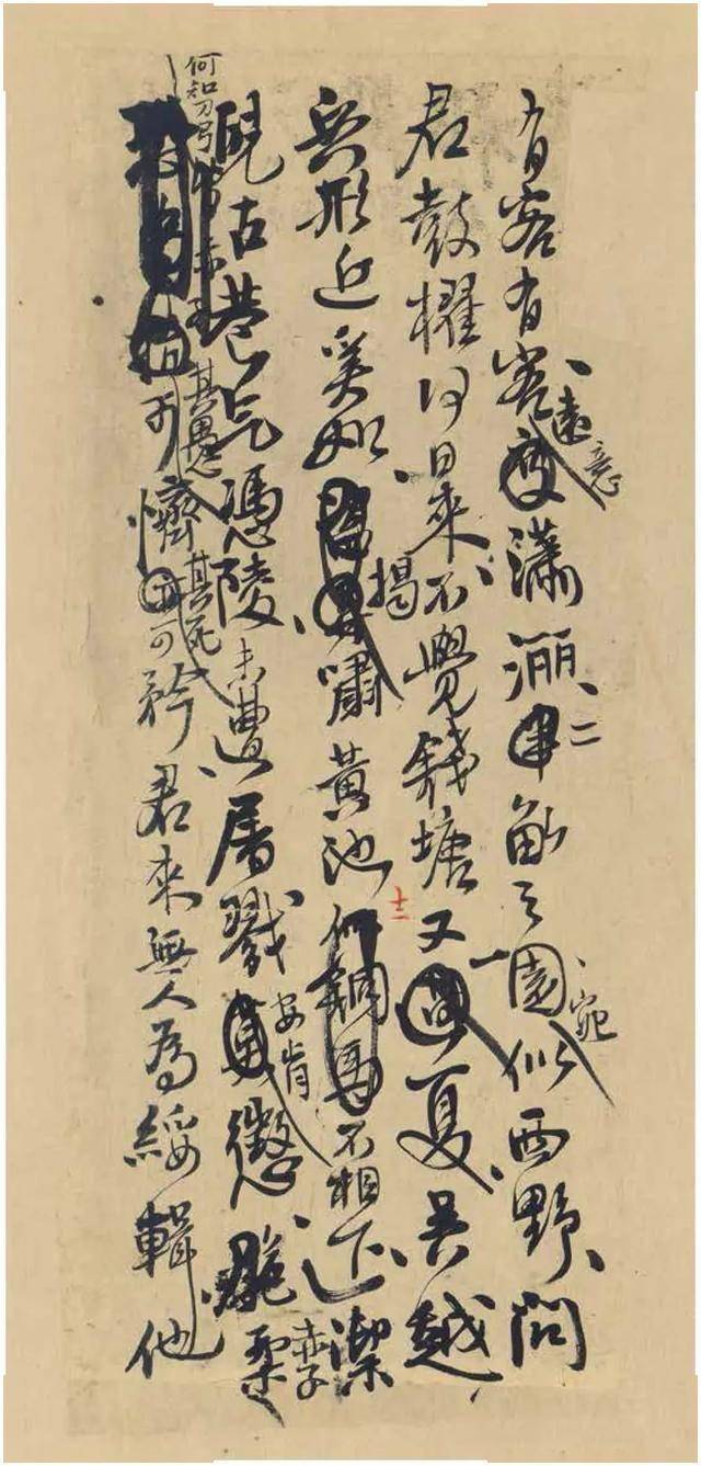 此帖虽看似杂乱无章,但细看之下它井然有序,它并不是一帖成品的草书作品,而是一份创作草稿,让我们了解到原来草书大家也是需要在创作之前打草稿的,更是让我们学习到在书法创作之时是如何打草稿并设计创作作品的。