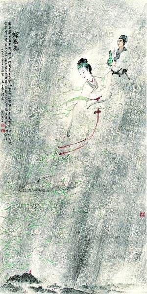再次,呈现出阳刚大美气象,以及革命现实主义和浪漫主义融合的审美气质。傅抱石曾说,《蝶恋花·答李淑一》《七律·送瘟神二首》《忆秦娥·娄山关》《十六字令三首》《念奴娇·昆仑》《水调歌头·游泳》等,“很谨严,同时又极生动,大气磅礴,如日中天”“是大家可公认为浪漫主义最突出的”。毛泽东诗词中多次描绘的夜色、秋意、水汽、春晖、晴光、雨声、微风、霞影、流云、树影、曙色、晨雾等,都在傅抱石的画中栩栩如生地再现出来。在画家所塑造出来的具体可感的空间中,有着萧疏、奇伟、瑰丽、朴茂、热烈、雄浑、激越、奔放、凄美、梦幻、浪漫、清新、明丽等审美意象。如《毛泽东〈蝶恋花·答李淑一〉词意图》绘大雨倾盆,云中嫦娥翩翩起舞,吴刚在其身后端酒而立,绿色的柳叶在雨中不断飘落;近景部分则画有无数红旗飘拂于万千峰峦间,象征革命的胜利。