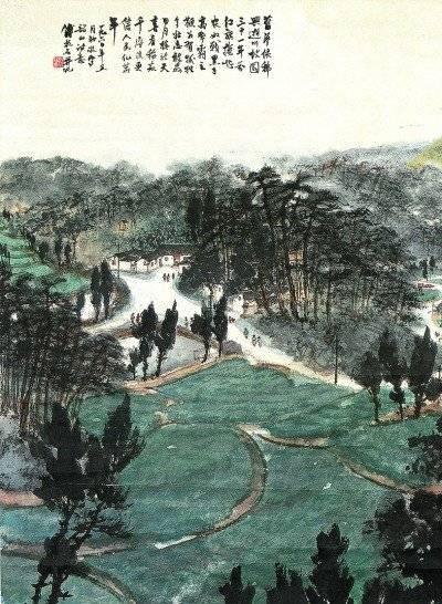 其次,重视写生创作。写生作为重要的创作手法,二十世纪初以来逐步为当时的画家群体所认可和接受,中国画的创作由此进入向大自然索取素材、向社会索取素材的道路。傅抱石的毛泽东诗意画创作,也十分重视写生的运用。他不断加入所观察到、感受到的真实物象,从而为画作带来真切的空间感和质感。傅抱石的画作,不是对诗词的图像阐释和描绘,而是具有写生带来的真实感,令人如临其境,如见其形。傅抱石自己具有在南京和重庆的生活阅历,新中国成立后赴韶山、延安等诸多革命圣地进行写生创作,把自己感受到、观察到的革命圣地的山川物象加以概括提炼,因而具有鲜明的现代感和浓郁的时代气息。如根据《七律·到韶山》中“喜看稻菽千重浪,遍地英雄下夕烟”诸句诗意,结合实地勘查写生而绘制的画作,全幅以写意笔法画出平畴、山川、河流、山路、村舍、林木、上工行走的人群以及参观故居的游人,物象极为丰满、多样,显现出画家驾驭山水场景的惊人能力。画面高度概括出湖南南部特有的山川景致,葱郁而丰茂,清新而秀丽,不愧为一幅优美秀雅的青绿山水画得意之作。