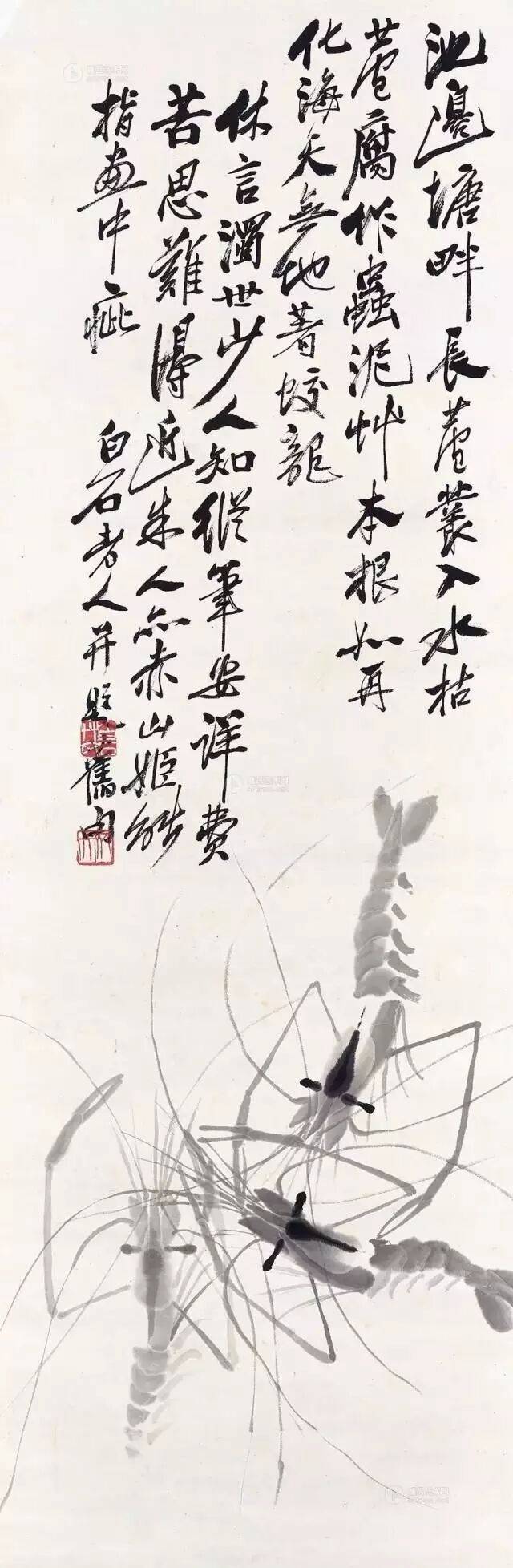 抗战胜利后的一天,同在北京的齐白石、张大千受徐悲鸿邀请一起吃饭。徐悲鸿的夫人廖静文亲自下厨,饭菜很可口,几人觥筹交错,言谈甚欢。饭后,齐白石乘兴挥毫,用墨画了三朵荷叶,又用红色画了两朵荷花,送给廖夫人,以示答谢。张大千应廖夫人之请,在画上再添几只小虾,在水中嬉戏。张大千画得入神,手舞笔飞,全然不在乎虾的节数,不是多画了就是少画了。这时,齐白石暗暗拉了他的衣袖,悄声说道:“大千先生,不论大虾小虾,身子只有六节,可不能多画、少画!”张大千听了,既惭愧又感激,便在画上又画了水纹和水草,把节数不准的虾身一一遮掩了。