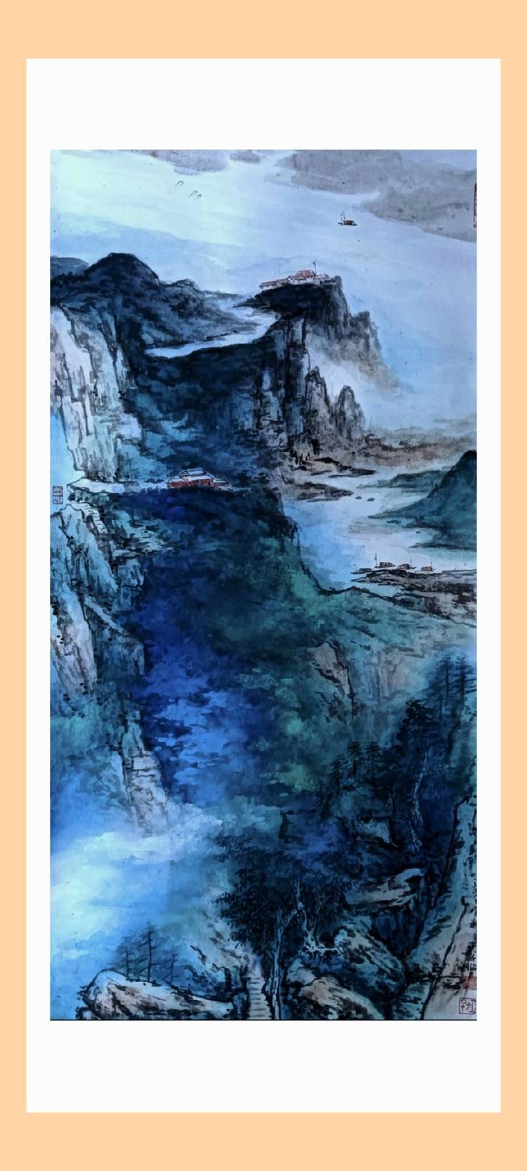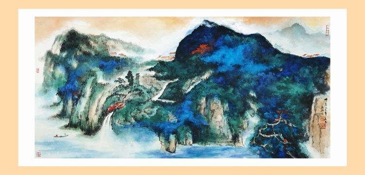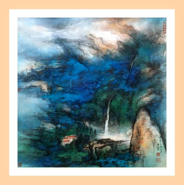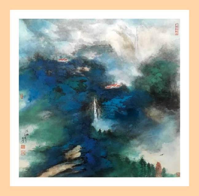 俞关佑的泼彩是传统绘画的拓展,也是对张大千艺术的完善。当俞关佑把传统笔墨的墨分五彩延展为五彩缤纷的世界时,当他立足于张大千而进行更加深入的探索时,他的泼彩就不仅仅停留在传统的“品”,或者张大千“观”的范畴,更多的则是心绪遐想中的 “游”和“居”。纵览俞关佑的泼彩,可以感受到,他追求的远观、旷达,追求的精微、细致,同时,也在追求感受、体验,换言之,俞关佑在追求艺术的整体性之时,又锲而不舍地去关照当代人的审美情趣。由于,当代大众受快节奏生活的影响,疲惫、焦虑始终挥之不去,大众精神上需要精致的“品”、旷达的“观”,然而,潜意识里一直在渴望“游”,期待身心自由的“居”,因为,游能心旷神怡,居能神有所归。俞关佑似若无意,然而,他的泼彩却恰恰触及了当代大众内心深处最敏感的区域。瞩目俞关佑的泼彩,千里之远尽出奇,万里山水得其妙,静静地待他的作品前,目光随着色彩的变幻而关照内心,心境则随着意境之妙而悠闲至极,仿佛身居世外桃源之中,又仿佛孤舟飘于茫茫湖水之间,心泯于超脱,情化于澄澈,流连、抒怀、神游、发呆,目之所及,心神澄澈,物我两忘。置身其间,飘逸的遐想油然而生,在妙境中养心,恬淡中悟道。岂是“品”、“观”可以悟得真味?又岂是“游”、“居”可以说得明白?