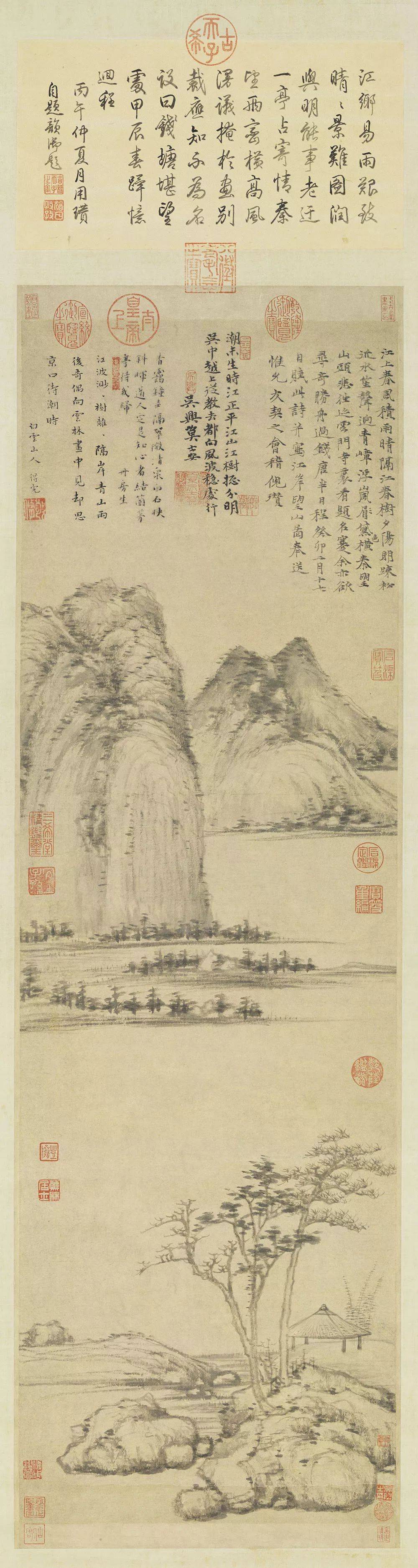 这种一河两岸的构图在元四家那里被承袭并表现至极致,吴镇的《渔父图》的恬淡空旷、赵孟頫的《秋江渔隐图》的寂寞凄清、倪瓒的《容膝斋图》的萧散疏淡,均以虚空为质,形成了一个清虚的天机世界。
