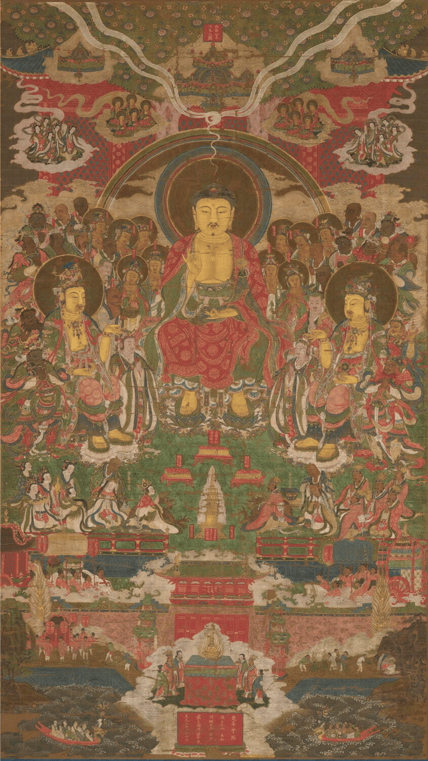 宋元佛画对东亚的绘画产生了非常深远的影响。朝鲜半岛的高丽当时尊崇佛教,高丽王朝达到了朝鲜半岛审美的顶峰,其中以佛画和青瓷为代表。遗憾的是高丽佛画随着朝代更迭,战乱等不断湮灭在历史中。现全世界仅存160件作品,其中130件均在日本。韩国仅存13件。本次将集中展示六件精品,其中李晟笔的《弥勒下生变相图》是高丽佛画中精品之精品。