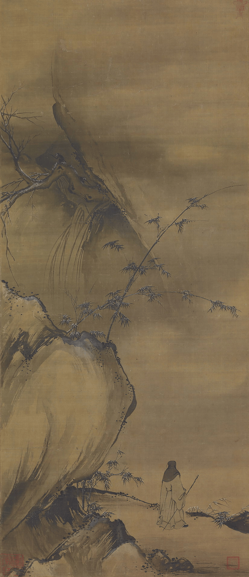 水墨画是中国古代绘画最为杰出的表现形式,而将水墨画传入日本的则是以牧溪为首的禅宗僧人。大批的南宋禅宗题材的水墨画随着中日间禅僧的交流传入日本,成为日本水墨画的源头。本章展出了以牧溪为首的南宋至元代的画家的11件作品。其中传石恪笔的《二祖调心图》为精品。