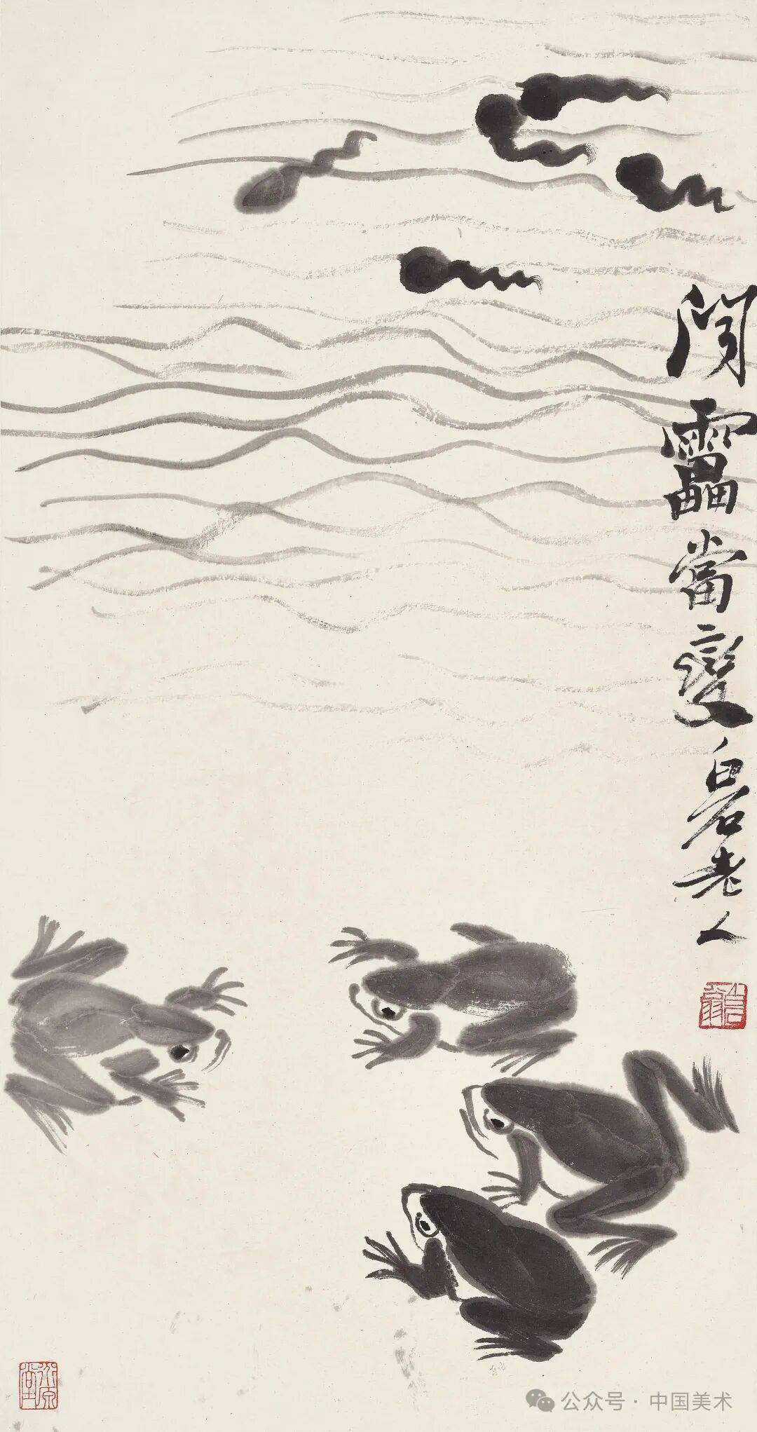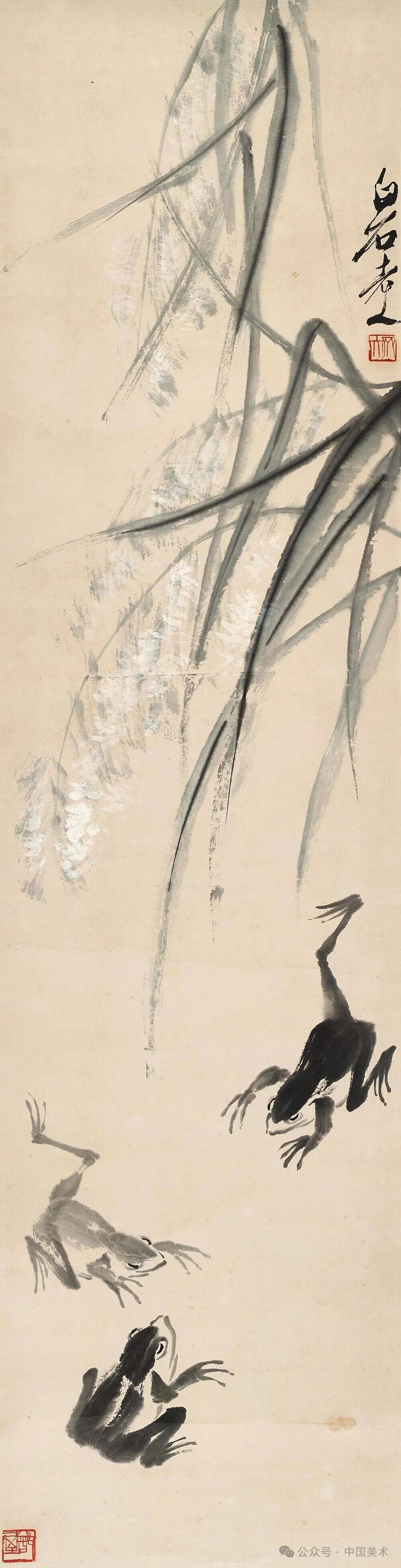 白石老人擅长以乡间动物入画,朴素的题材,以大写意的笔墨写就,独步近现代画坛。在齐白石的笔下,青蛙与蝌蚪是其笔墨意趣的体现,曾题画记其少年事略有云“予少时居星塘老屋,与蛙为邻,今日故能画蛙。”亦曾对友人云:“蟹是有壳的,蛤蟆是无壳的,若画蛤蟆的身子和腿同螃蟹一样,那算什么艺术呢。”诚然,在白石老人的笔下,寥寥数笔写成蛙之身躯,后腿更是关键,落笔既是准确的造型,又富于力量感,栩栩如生,跃然纸上。