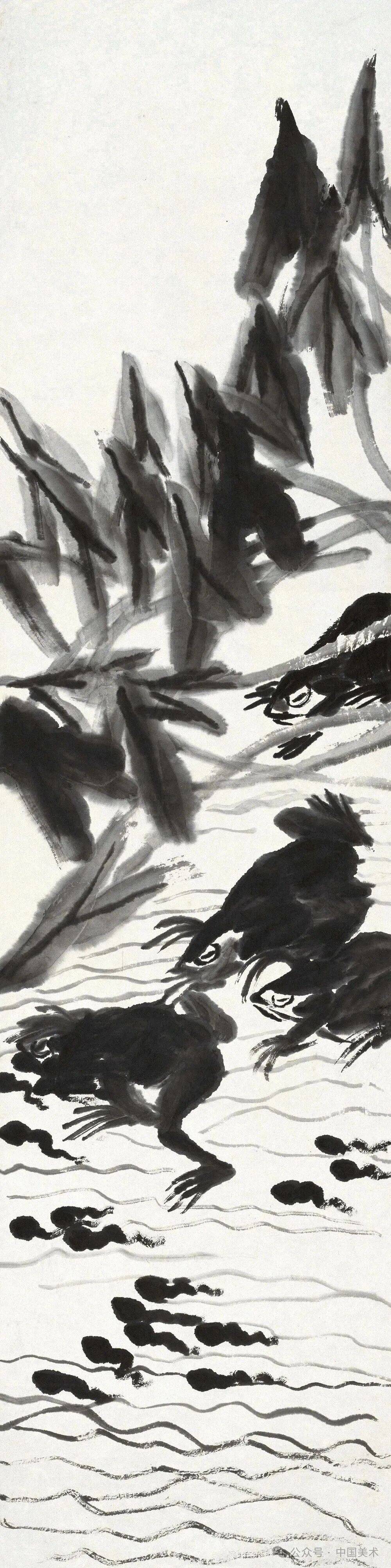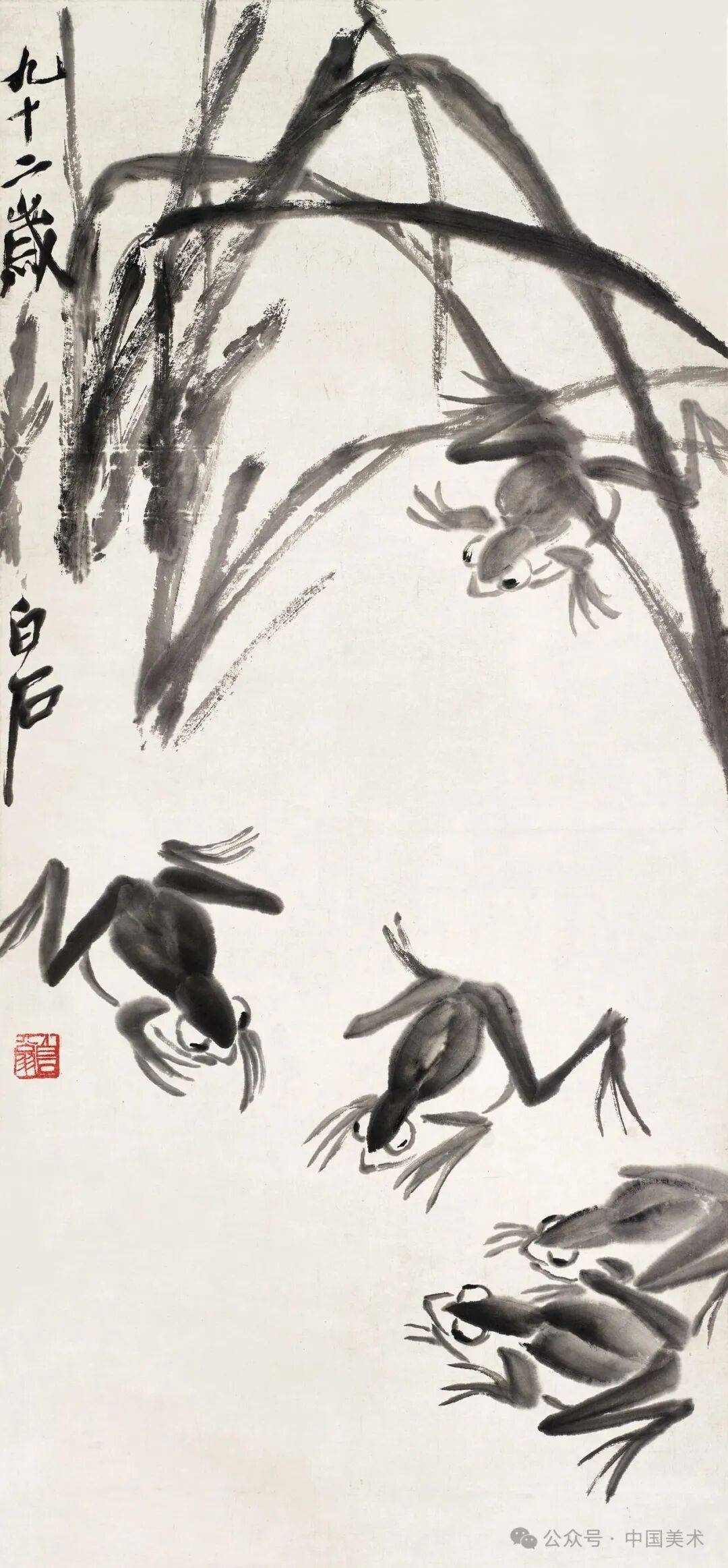 齐白石《青蛙蝌蚪》136x33.5cm,纸本墨笔,北京画院