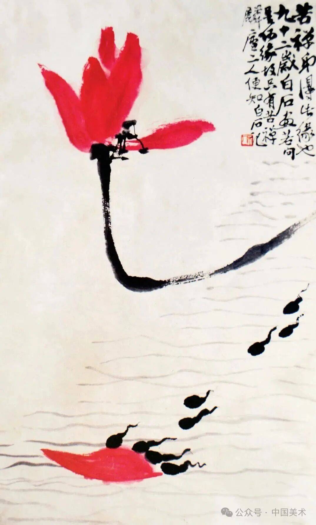 齐白石 红荷蝌蚪图