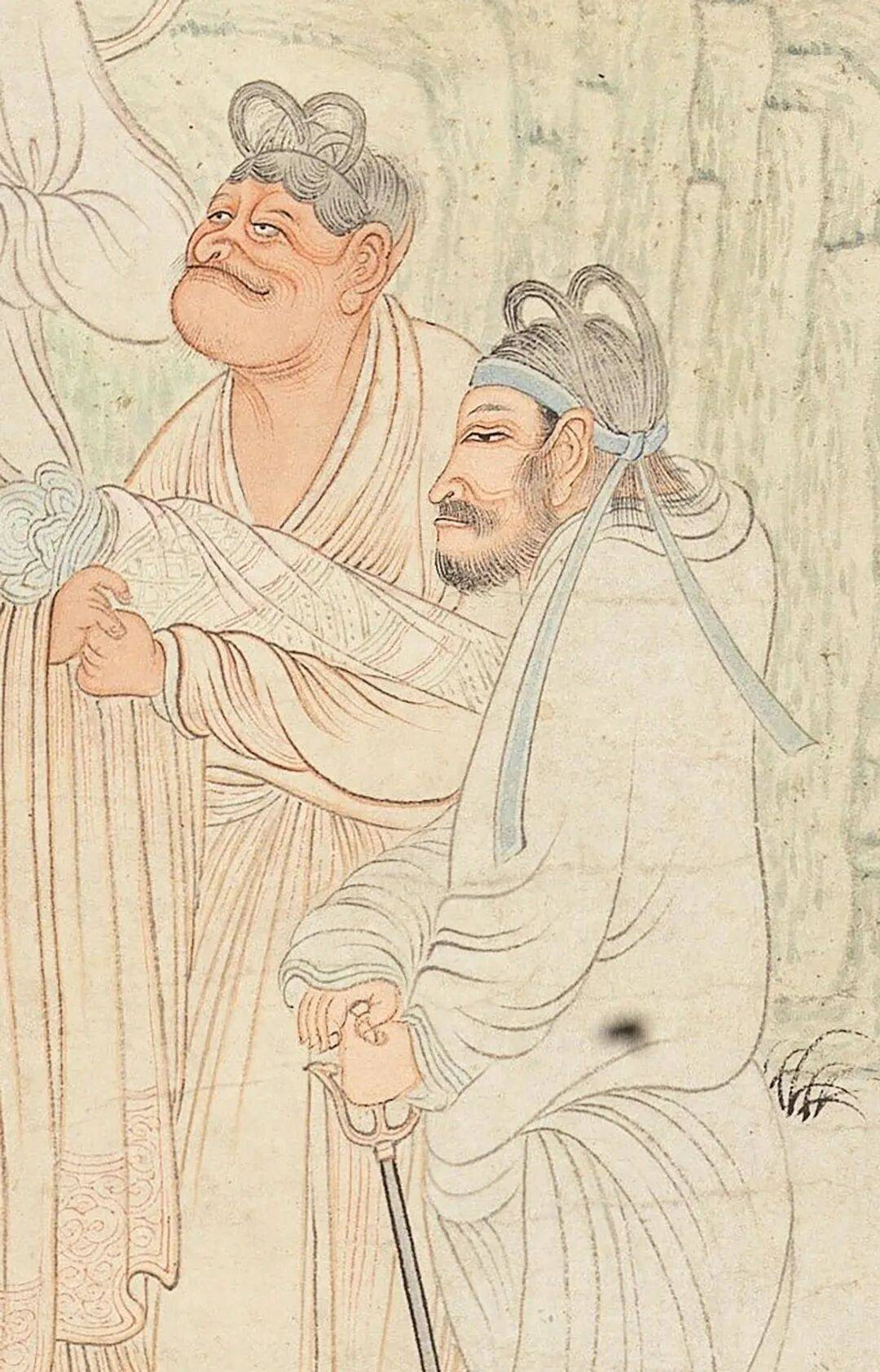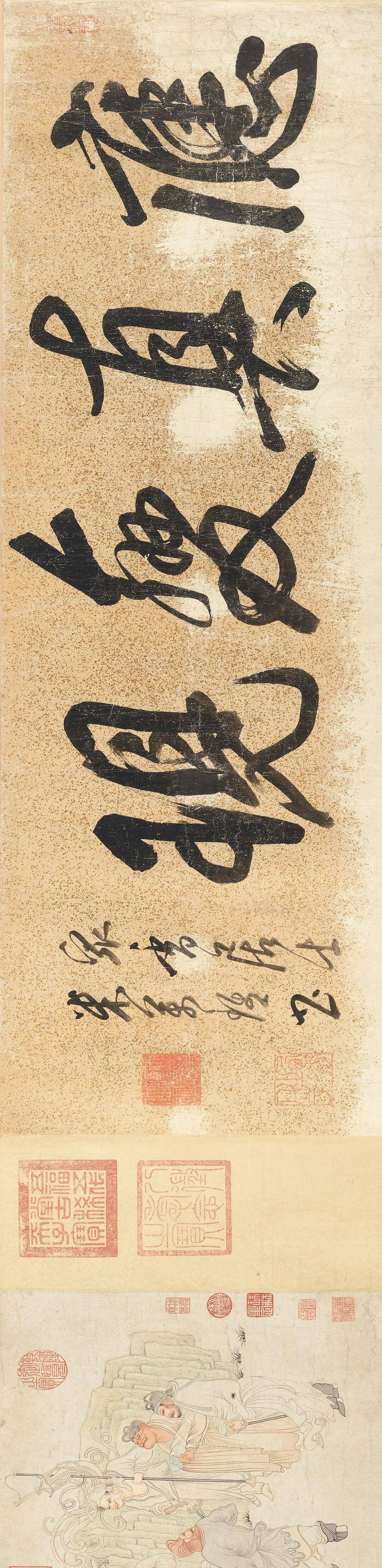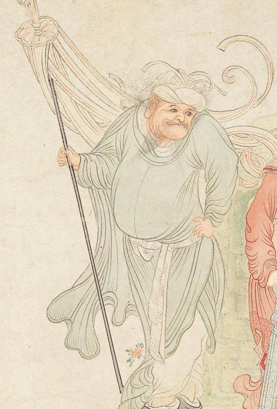 画中罗汉形象以白描绘之,奇形怪异,其灵感可能来自于一些流行的宗教题材戏剧或宗教活动中的造型,极具戏剧性色彩!
