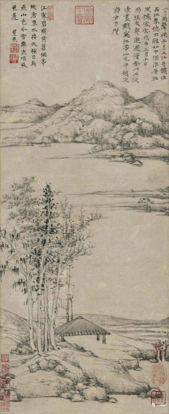 正是在这二十多年的漂泊生涯里,倪瓒画中标志性的“一河两岸”构图逐渐成型。近景是疏树怪石,中景留白,远景淡山如黛。而水边总有一座空亭,这空亭堪称倪瓒的精神自画像。“一带远山衔落日,草亭秋影淡无人”,亭中虽空无一人,却满是对人生的深刻叩问。它以“无人”隐喻着生命的漂泊本质,人如过客,没有永恒的居所,恰似倪瓒所言“人世等过客”。