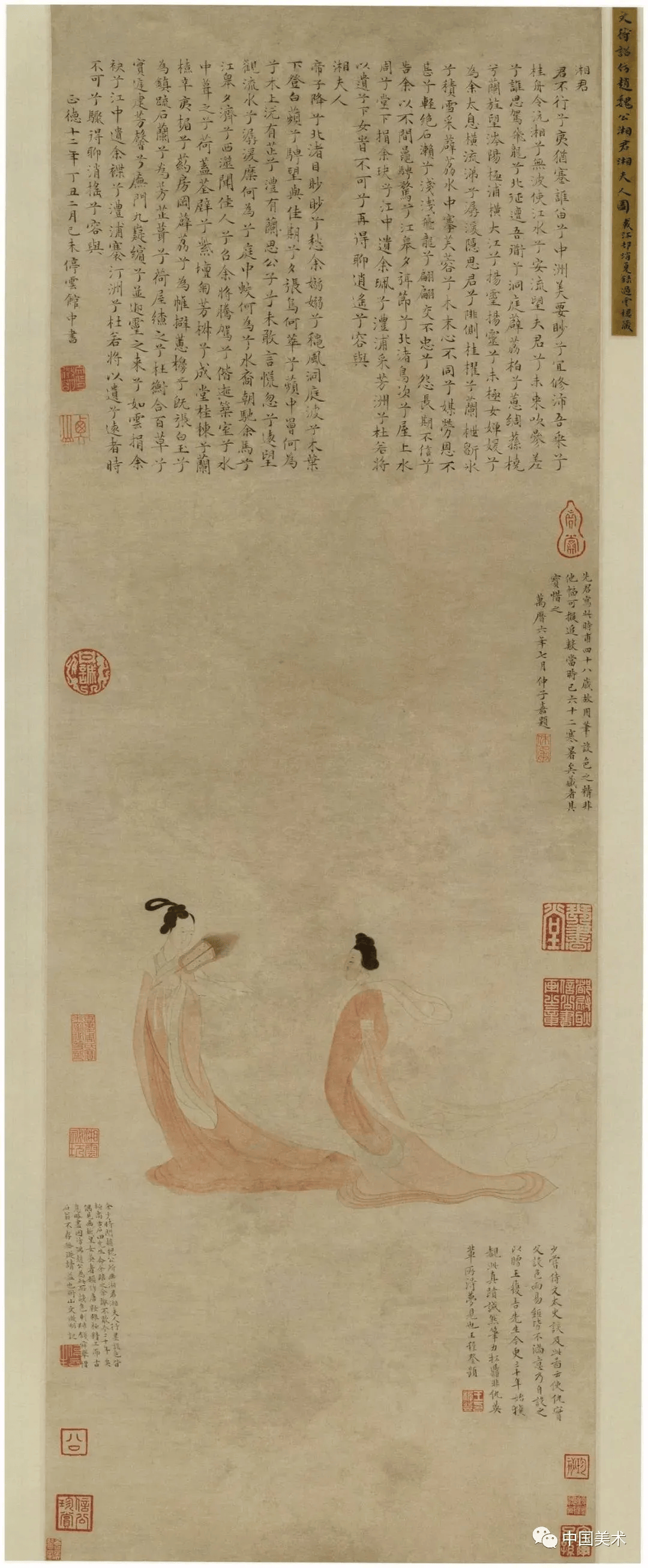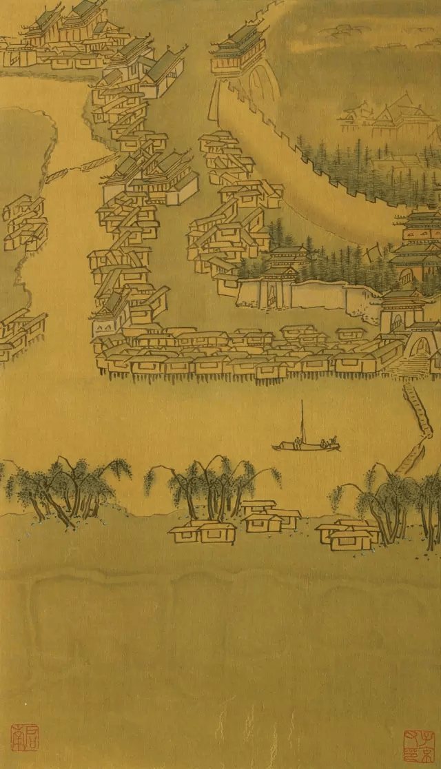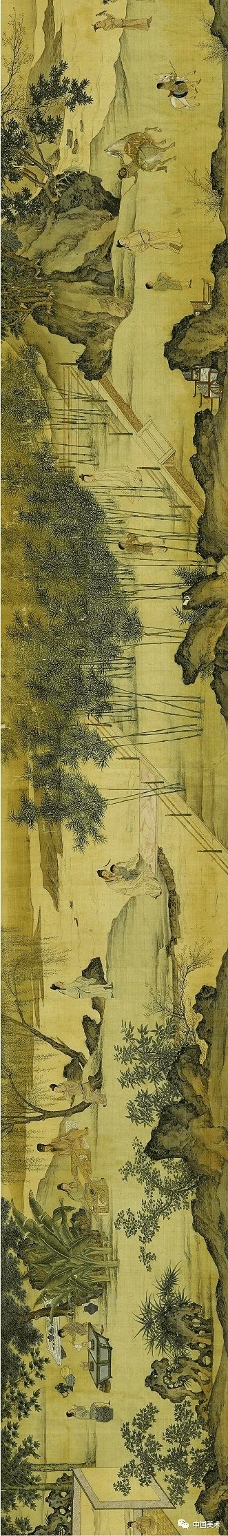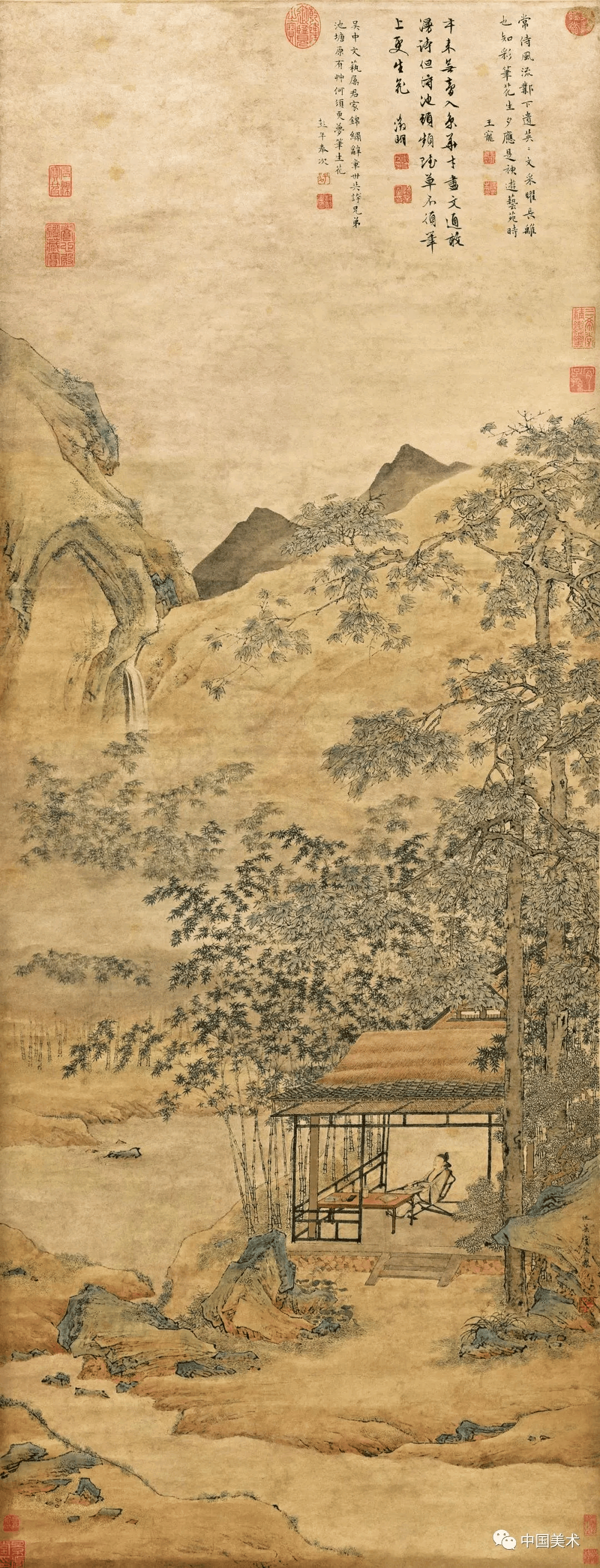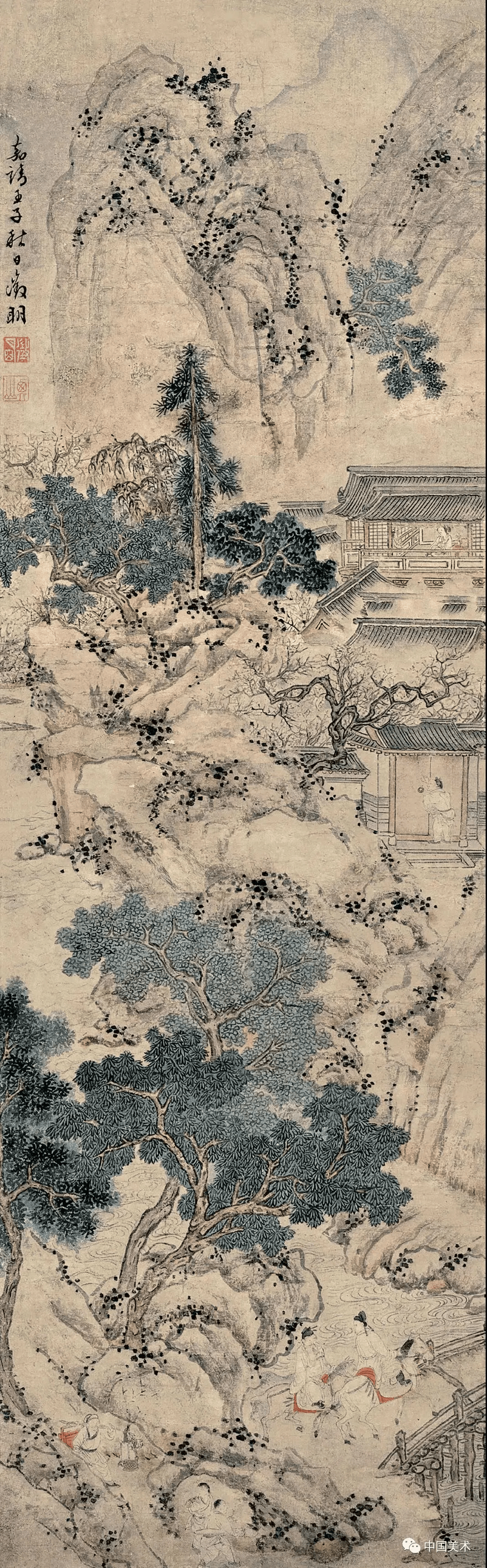 仇英,江苏太仓人,初为漆工,曾拜周臣名下学画,后在鉴藏家项元汴、周六观家观摩大量古代名作,技艺大进,自成一家。擅长山水、人物。山水主宗赵伯驹和南宋“院体”,以青绿重彩为主。仇英年轻时以善画结识了许多当代名家,为文征明、唐寅所器重,仇英的好友彭年记载:“十洲少既见赏于横翁(文征明)”,又拜周臣门下学画,并曾在著名鉴藏家项元汴、周六观家中见识了大量古代名作,临摹创作了大量精品。他的创作态度十分认真,一丝不苟,每幅画都是严谨周密、刻划入微。