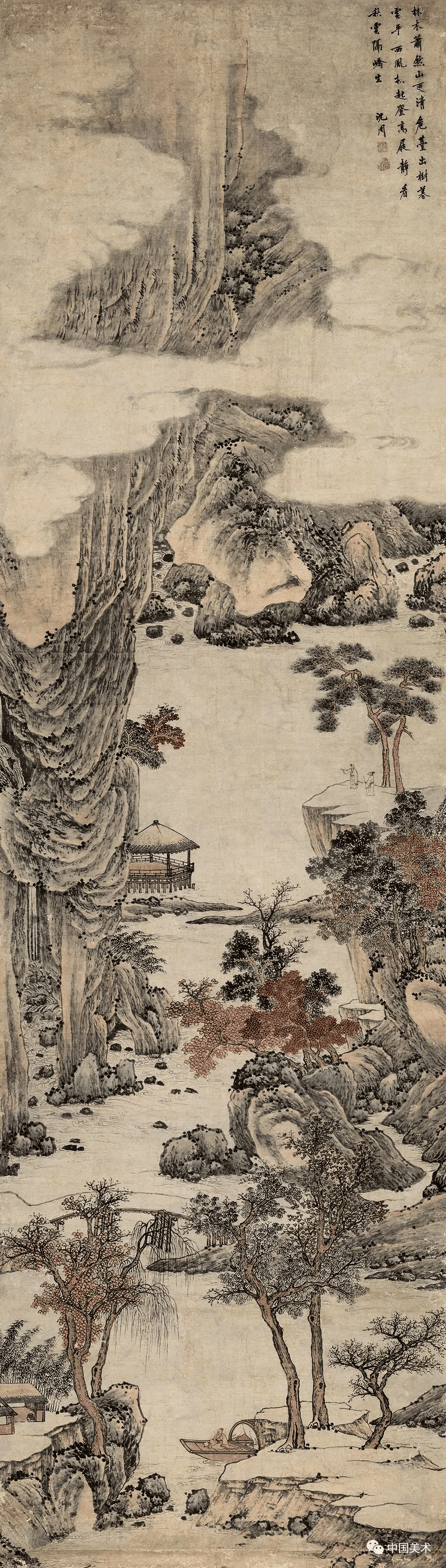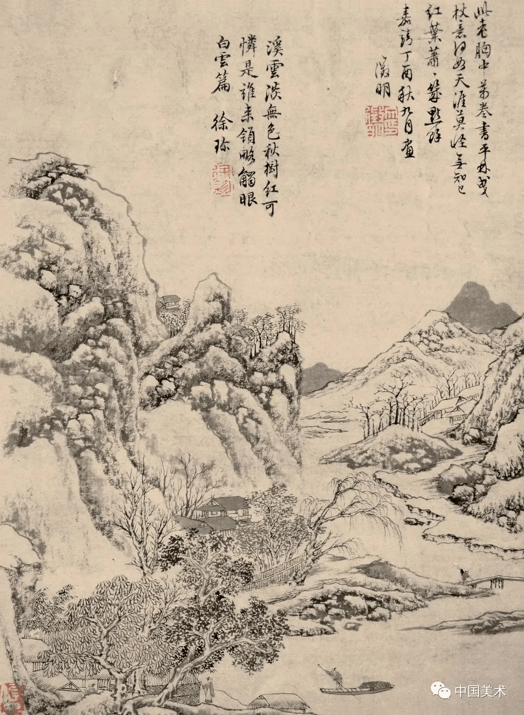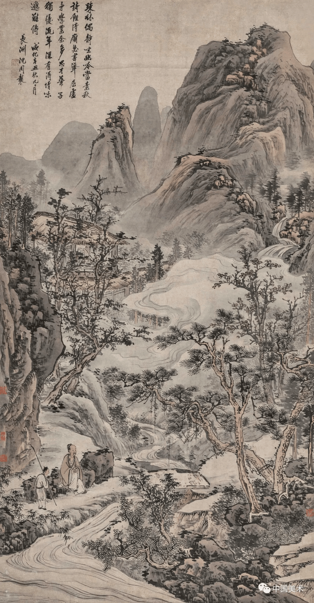 吴门四家中的沈周与文徵明,是吴派文人画最突出的代表,他们的绘画创作以山水为主,无论淡雅的青绿,还是沉雄、文秀的水墨,大多描写江南风光和文人园林。他们以诗书画三位一体抒写情怀,山水画以水墨及水墨淡着色引人注意,都有粗细两种面目。