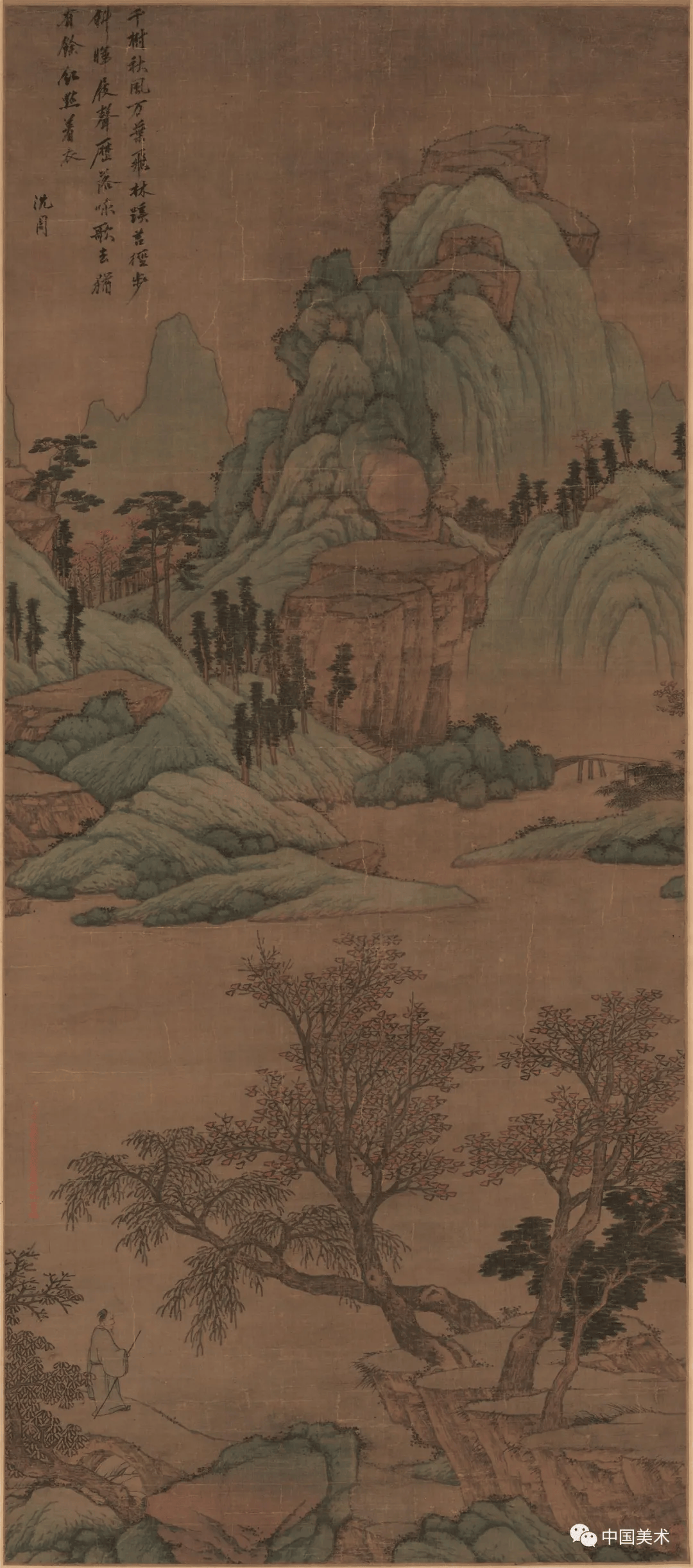 沈周山水画还呈现出早、中、晚期的变化。文献记载40岁前是他艺术创作的早期,但从传世作品推断,他的早期应在45岁以前。沈周的父亲恒吉、伯父贞吉均善画,他早年承受家学,兼师杜琼,故深受“元四家”的影响,尤主宗王蒙,并上追董、巨画风。景色繁复,笔法细密,山石作披麻兼牛毛皴。文献记载其书法早期学馆阁体的代表书家沈度、沈粲的墨迹,字体端庄平整而秀丽。