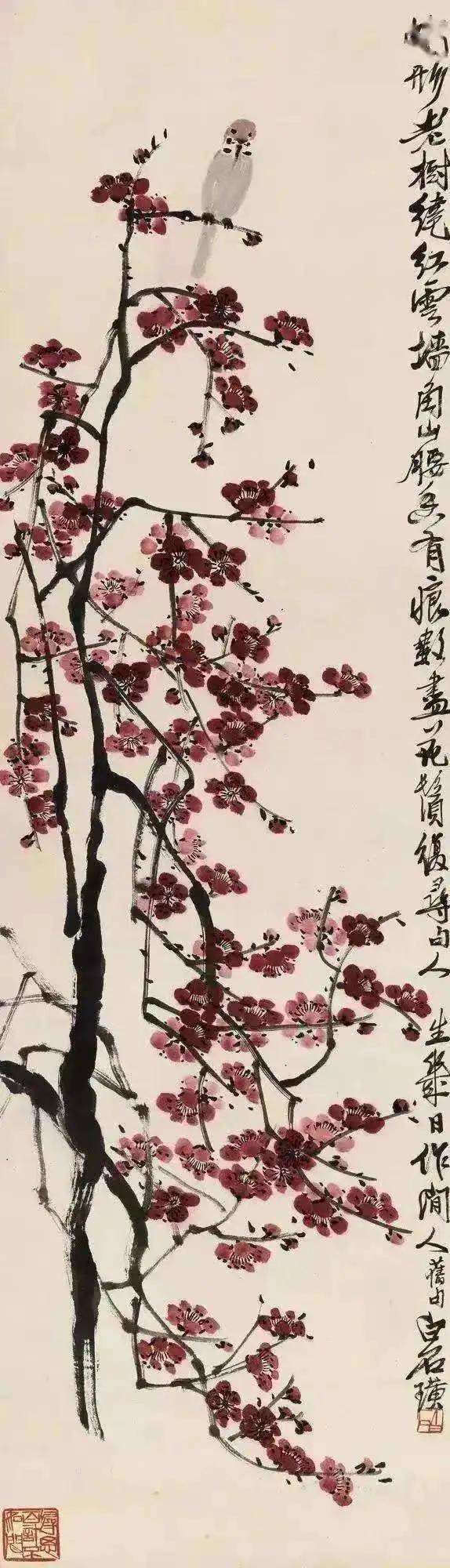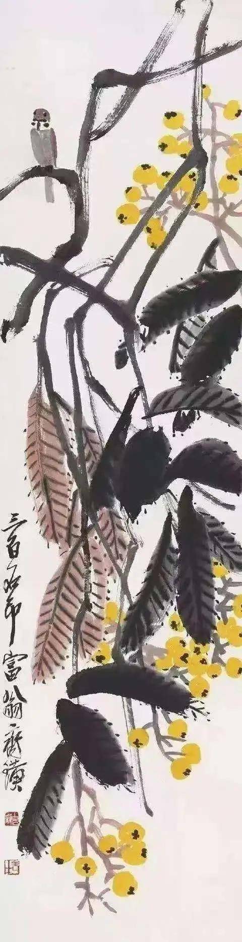 他画鸟,不刻意求“形似”,却在“神似”处直击人心。枝头麻雀,几笔勾勒出蓬松的羽感,圆睁的小眼珠透着机警,似刚从稻田间掠过;寒梅孤雀,梅枝苍劲如铁,雀儿缩颈小憩,冷香与雀意交融,满纸都是冬日的清寂与生机。