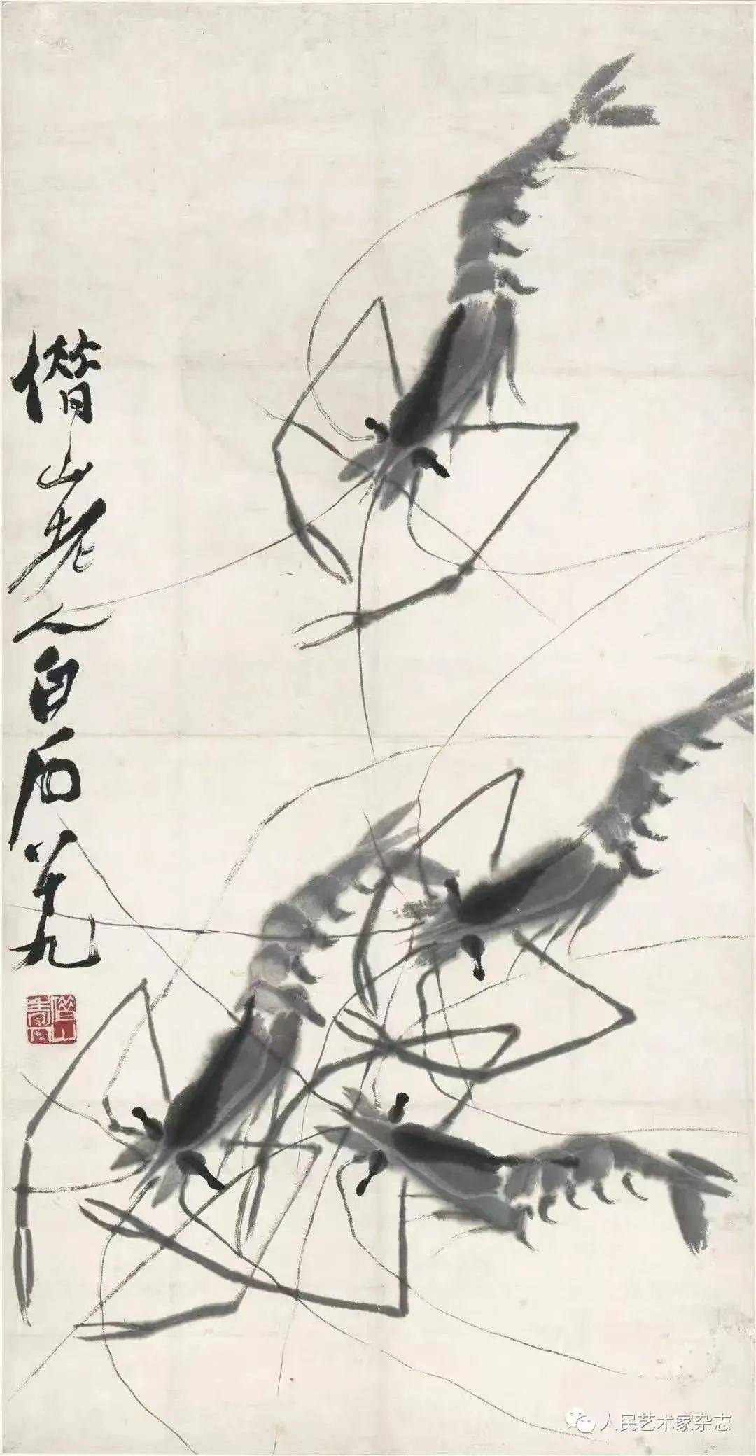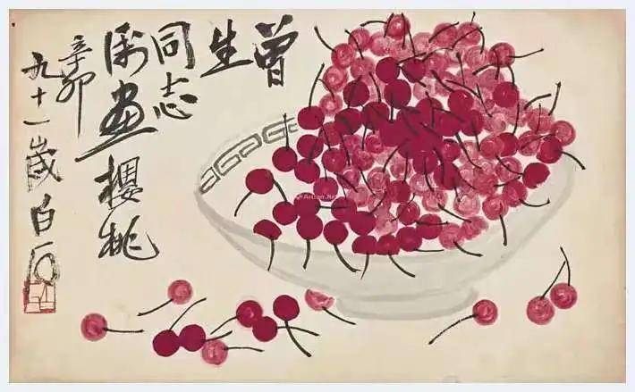 寻常果蔬,经白石先生的笔,便成了雅俗共赏的意趣小品。一篮樱桃,朱砂点染,颗颗饱满如玛瑙,衬着墨叶,鲜活得似要滴落;半筐青虾,墨线游走如游龙,虾须轻佻,虾钳灵动,水墨间尽是水泽里的鲜活气息。