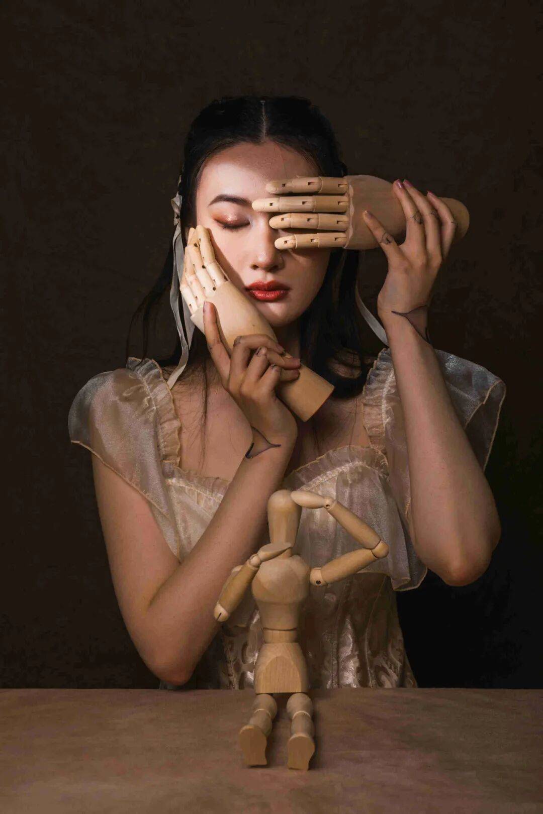 桌上的木偶像是她自身的投影——简化却又熟悉的存在。那断裂却又可控的木质肢体,似乎暗示着在掌控与自主之间的挣扎。她手指和手腕上的暗色印记宛如机械关节,模糊了血肉与木偶之间的界限——仿佛提醒着人们,社会期待、传统束缚,甚至个人的不安都可能让人感到被操控或不完整。