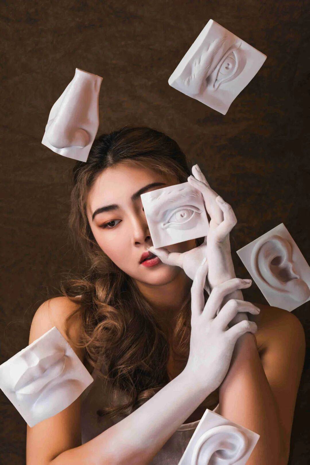 在一个由感知碎片拼凑成的世界里,一位年轻女子被一块块凝固的人体感官所包围——耳朵、眼睛、鼻子、嘴唇——它们被固定在石膏中,象征着社会如何将人的感官孤立出来、片面评价,而忽略了一个完整的个体。