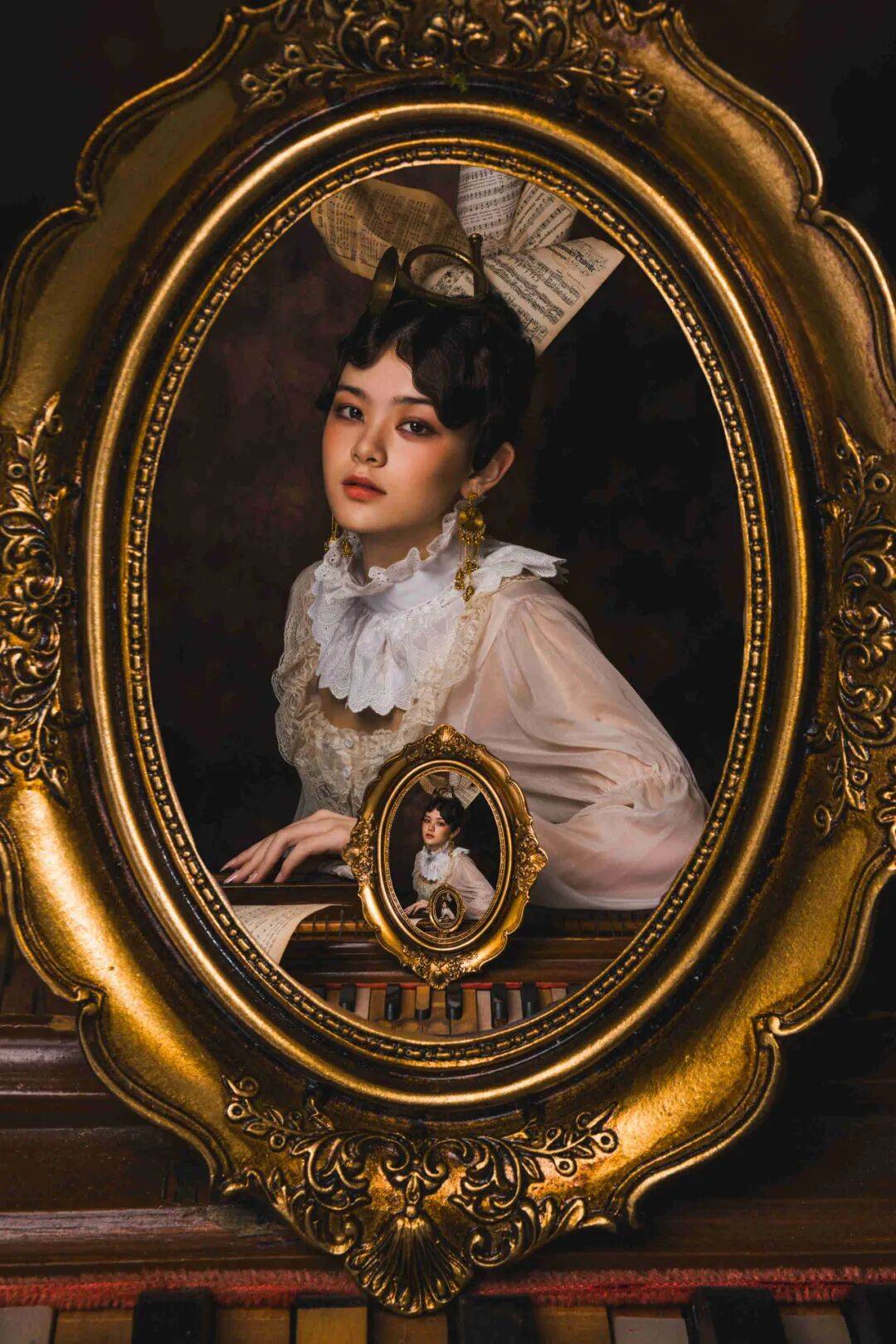 她面前那面华丽的金色镜框并非普通的镜子,而是一件承载着神秘力量的古物。每当她凝视镜中的自己,便会发现那不仅仅是一副倒影,而是无尽的递归——一个个越来越小的肖像仿佛在不断向过去折叠,现实与回忆交错相融。