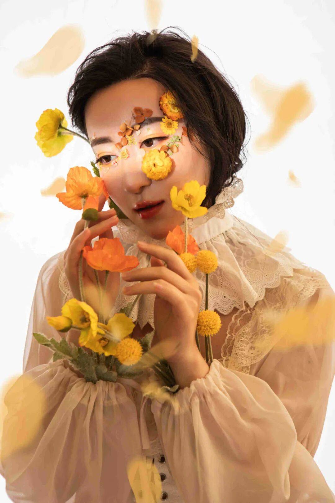 一位女子静静伫立,周身被纷飞的花瓣与轻柔的花朵环绕。花朵不仅围绕着她,似乎也从她体内悄然生长而出——缠绕于衣领,簇拥于指尖,蔓延于面庞,仿佛她本身便是一座盛放的花园。