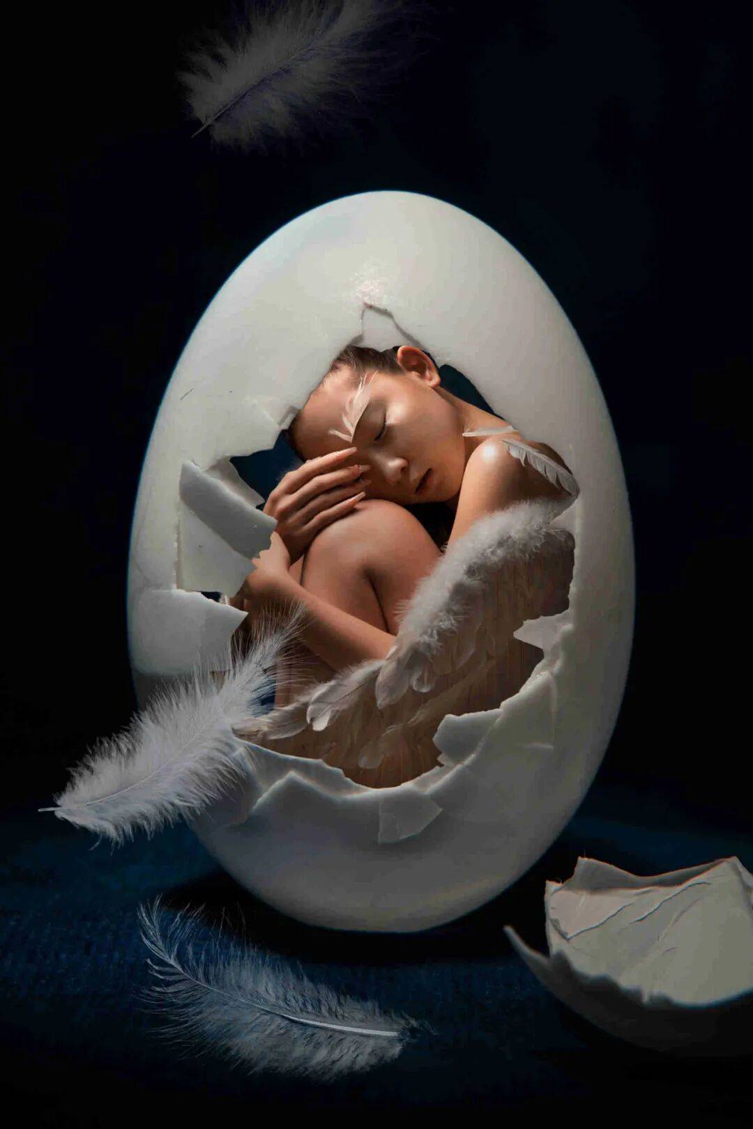包裹着她的蛋壳不只是摇篮,更是蕴藏无限可能的圣所。壳上的裂痕不是破碎的象征,而是即将重生的低语。飘落的羽毛,轻柔如梦,仿佛来自尚未经历的生命片段——尚未张开的翅膀所留下的痕迹。她曾是光的生灵,如今披上悲伤的羽翼。黑羽浸透着被遗忘的祈祷,在泪与光之间闪烁。她周身弥漫着一首破碎的咏叹调——关于飞翔的回忆,却再也无法重现。