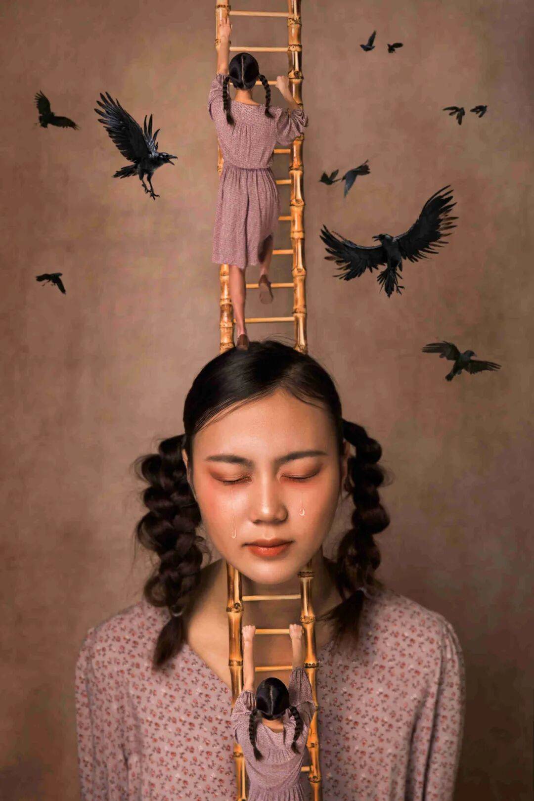 每一根梯级,都是她曾经历的痛苦——她流下的泪,如今化作支撑她前行的阶梯。乌鸦在空中盘旋,像是疑惑与恐惧,试图将她再次拖回沉默的深处,但她仍在继续攀登。