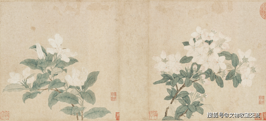 画后文嘉、王穉登、董其昌等题跋可知该卷最早为明莫是龙所藏,再经张丑、吴升等,后又递藏至庞元济,可谓流传有绪。该件作品20世纪50年代经谢稚柳鉴定,从山石画法、林木表现,以及与郭熙、王诜现有作品的画风比较,最后定为王诜所作。这一结论在张珩《木雁斋书画鉴赏笔记》中也得到了印证:此卷旧定作郭熙,盖据卷后文嘉跋。然笔墨虽佳,终觉不类。大凡山水为最,树次之,人物更次之,不能如河阳之功力悉敌。又构图布局虽是北宋典型,亦有许多欠缺,不能工稳。谢稚柳定为王诜之作,信而有征,其树尤与《渔村小雪》无异,宜从之。由此,该卷为王晋卿之作至今已成学界共识。此外还有1917年元代钱选《来禽栀子图》,同样是通过庞莱臣之手而购得的花鸟画精品之作。