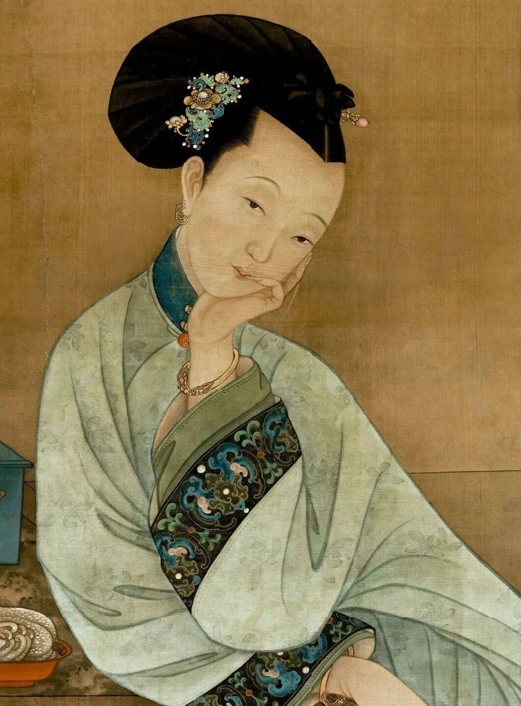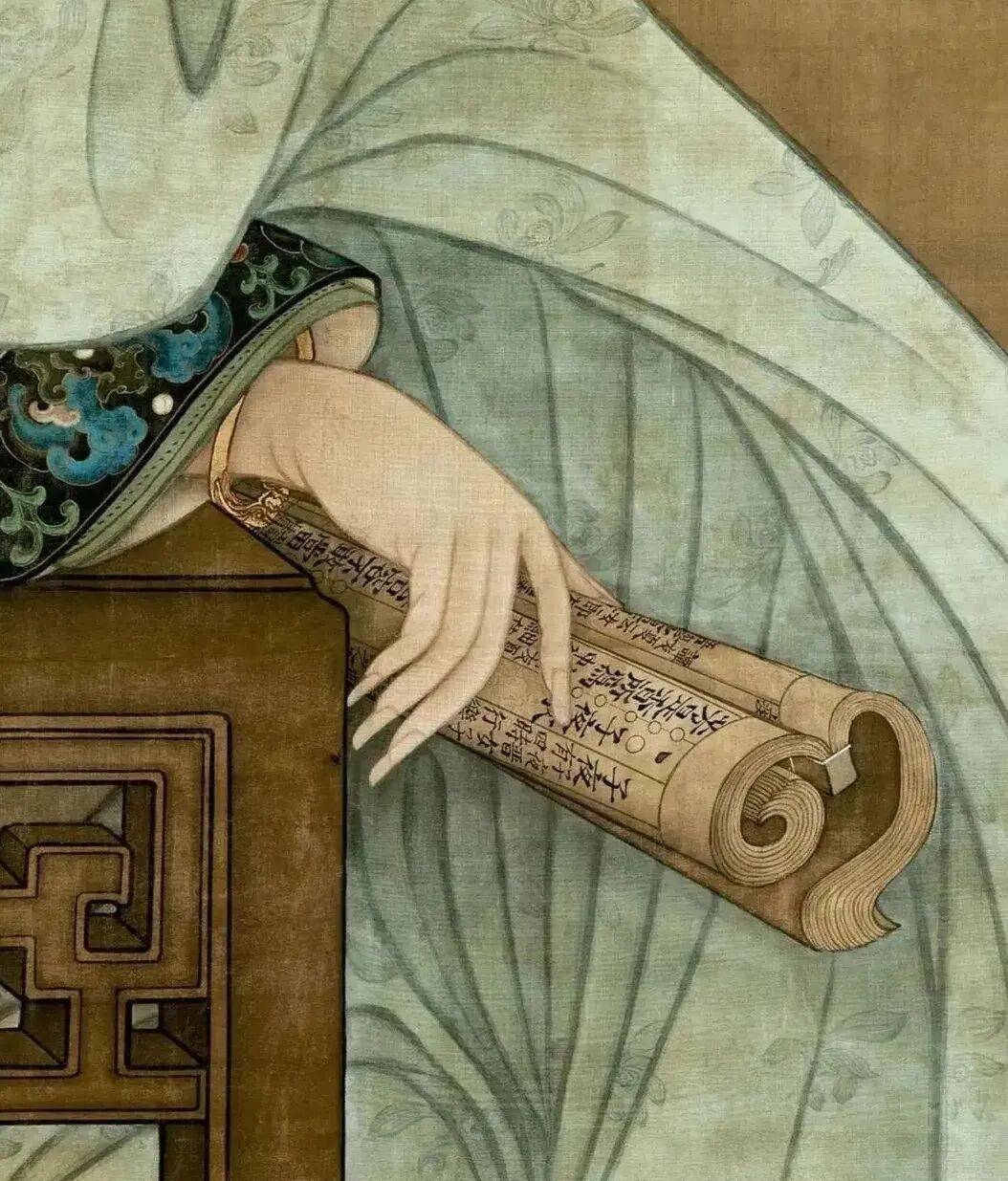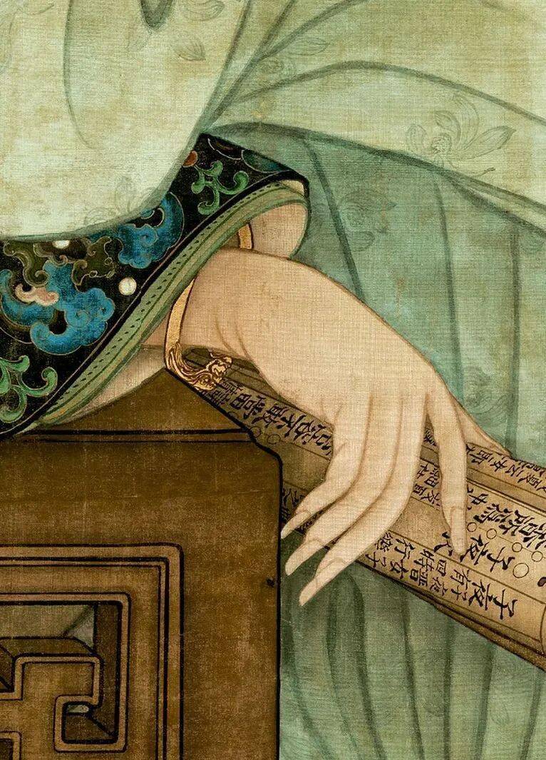 顺着画面这优美的线条,观者会很自然的关注到画面中部——这位女子手中拿着的一本书,这是一本什么样的书呢?竟然会让女子有这般倦读的模样!