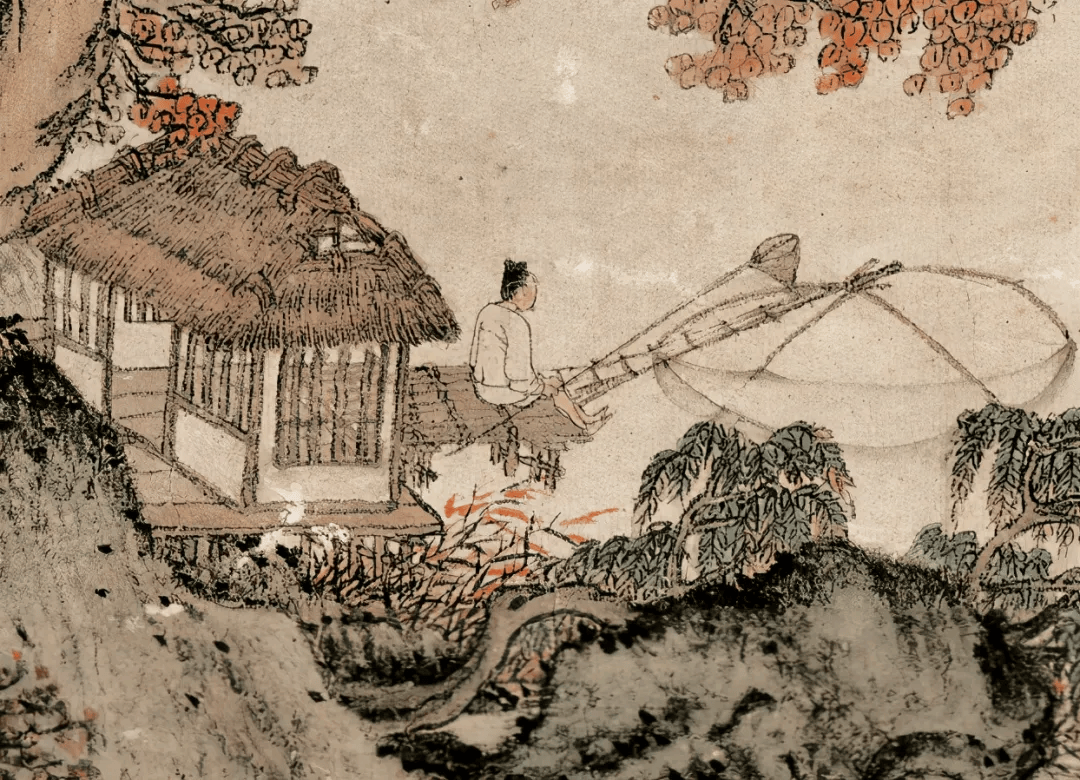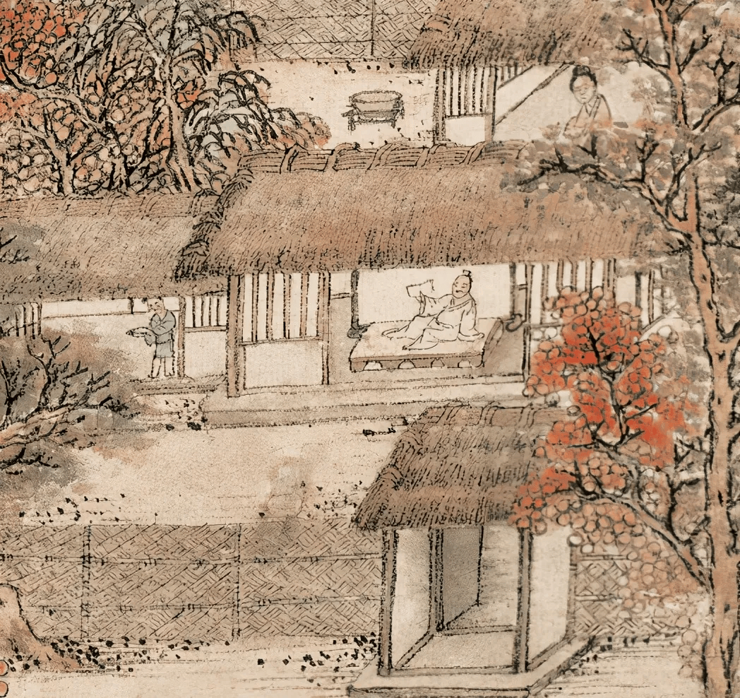 临水的茅亭中,有人正在捕鱼。文士惬意地踞坐家中榻上读书,身后妻子在忙碌,一旁的小童在自顾嬉戏。