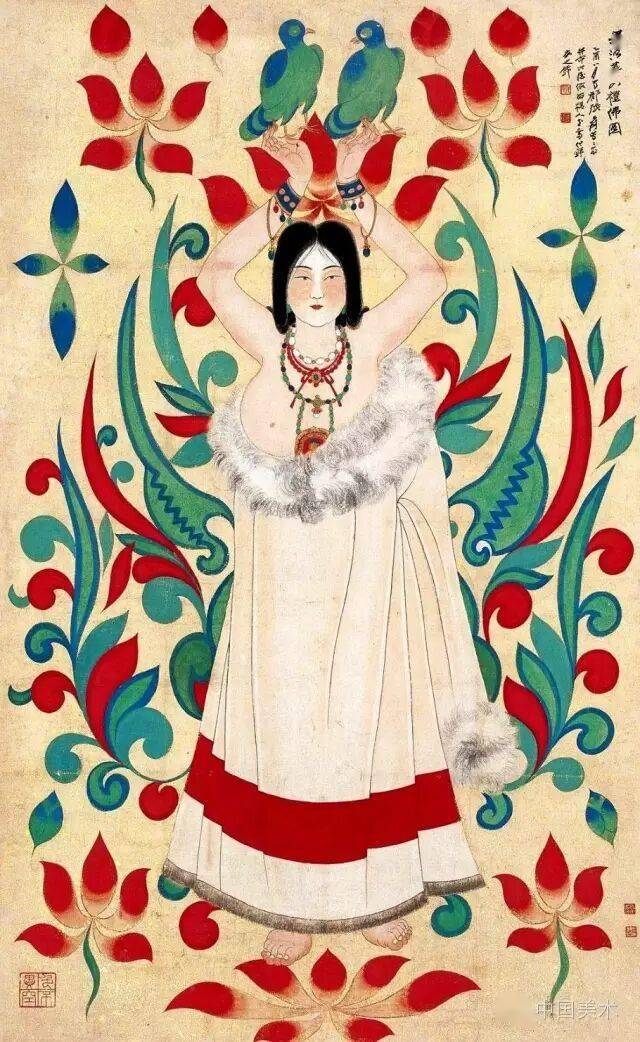 近代因为中国国势衰弱,而画家所画人物,尤其是美女,无论仇十洲也好,唐六如也好,都走上文弱一条路上,多半是病态的林黛玉型的美人。因为中国一般人的看法,女人是要身段苗条,弱不禁风,才足以表现东方优美的典型。这一直相沿下来好几百年,无人起来做一种纠正运动。到了敦煌画面世,所有画的女人,无论是近事女、供养人或国夫人、后妃之属,大半是丰腴的、健美的、高大的。我们看北魏所画的清瘦之相,而到了唐代便全部人像都变成肥大了。这也可证明唐代的昌盛,大家都够营养,美人更有丰富的食品,所以都养的胖胖的。因为画家是写实的,所以就把唐人胖美人写下来了。后来玄宗宠爱的杨贵妃,也是著名的丰腴之流,或者唐代风尚如此也未可知。但在画坛里,我们画了林黛玉型的美人,差不多有好几百年了,忽然来一个新典型,杨贵妃式的胖美人,当然可以掀动画坛。所以现在写美人的,也都注意到健美这一点了。